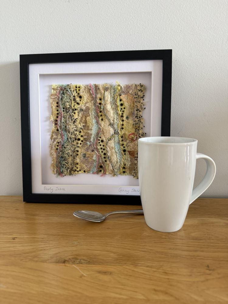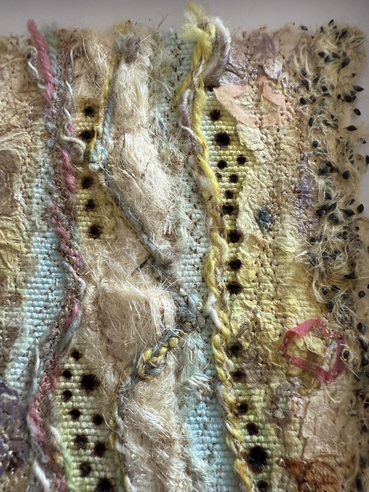 A fusion of upcycled textiles, yarn and eco paper embellished with tiny singed holes using a soldering iron. It comes in a black MDF glazed box frame so that its myriad of textures can be appreciated.
