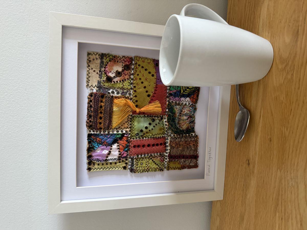 This unusual patchwork of upcycled fabric is stitched, melted and singed. It includes a tassel from a discarded tablecloth from India, some used tea bag paper and tangle weave which Ginny creates by sewing threads and minute scraps together to make a sheet of unique fabric. It comes in a white MDF glazed box frame, which shows off its textures to best effect.