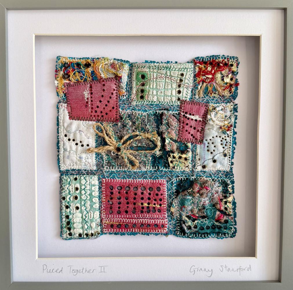 This unusual patchwork of worked and reworked squares, created using upcycled fabric is stitched, melted and singed. It comes in a grey MDF glazed box frame, which shows off its myriad of textures to best effect.