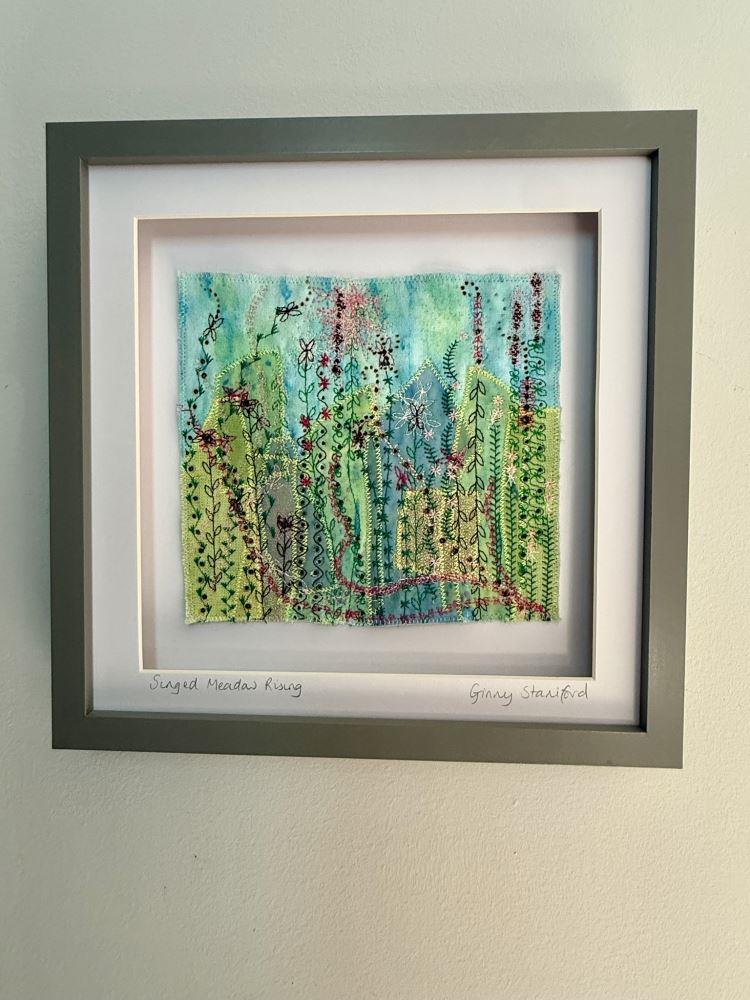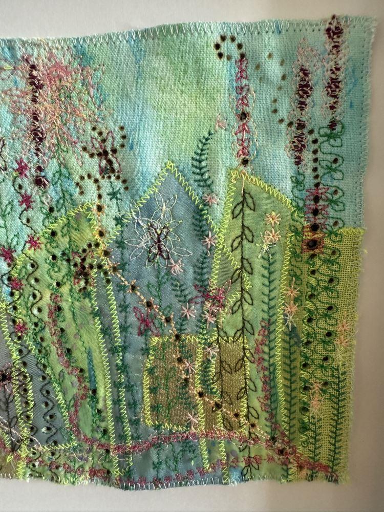 A pretty, but unusual artwork created by stitching and burning upcycled textiles and embellishing with textile paint and dye