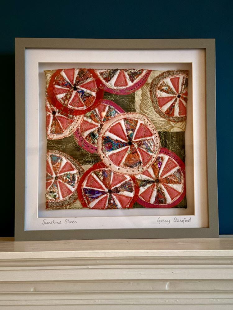 This is a unique piece created by upcycling textiles. This piece features 'tangle weave' which Ginny creates by sewing threads and minute scraps together to make a sheet of unique fabric. It is bright and cheerful and lifts spirits even on the dullest of days.