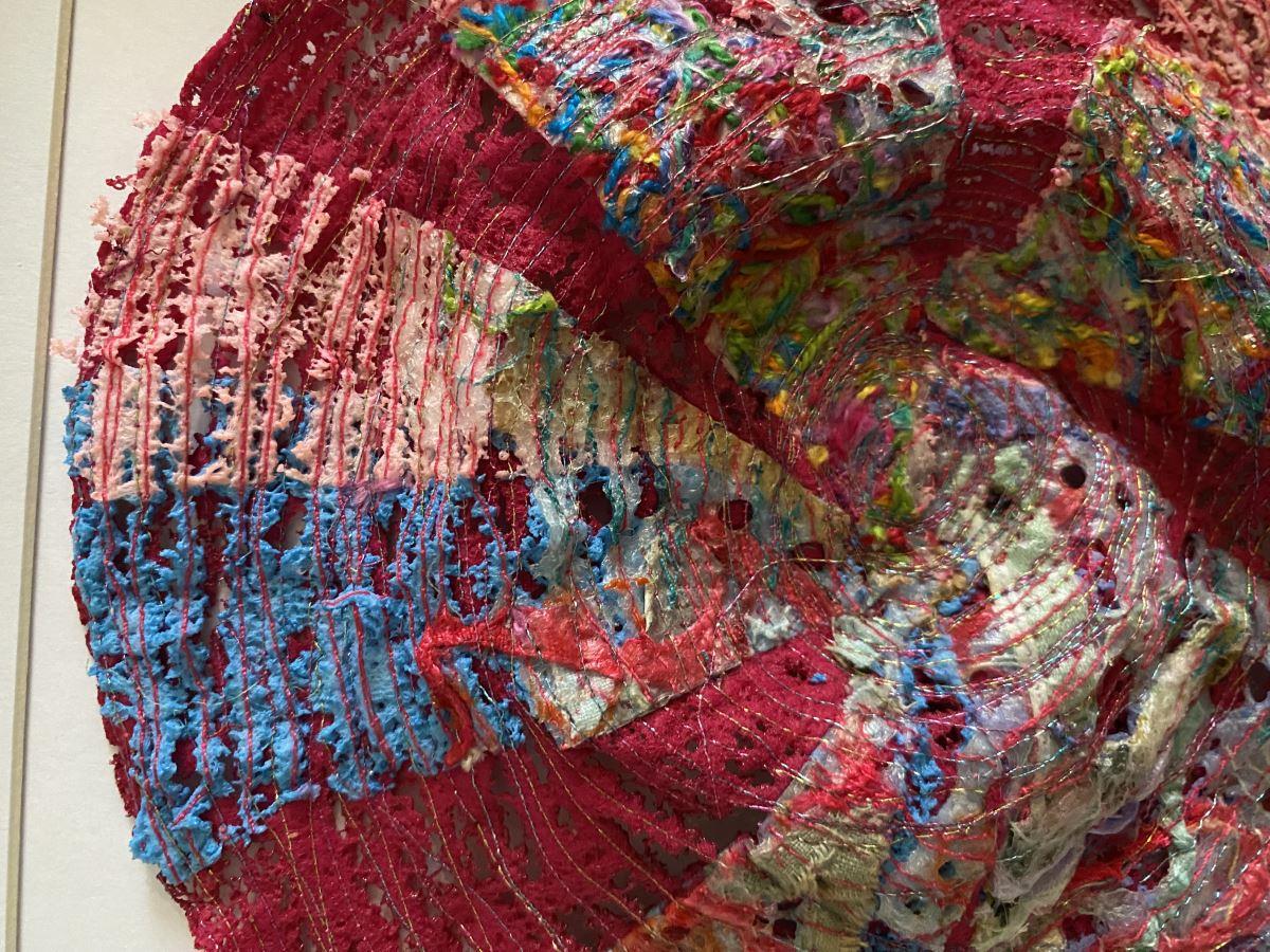 A circular metallic stitched piece resembling an unfairly cut cheesecake! Created by upcycling textiles, in particular 'tangle weave' which Ginny creates by sewing threads and minute scraps together to make a sheet of unique fabric. Ginny melts and burns the materials to get an unusual and unique texture and effect. It is presented in a grey MDF glazed box frame which shows off the textures to best effect.