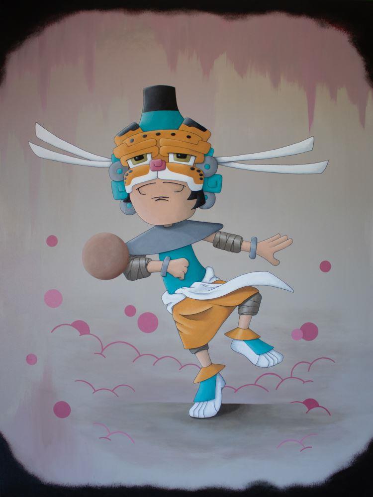 Contemporary art based on Aztec Mythology in a Street/Subway Art style. The stories and adventures of Tupak a young Jaguar Warrior are told within many of my Aztec pieces. This piece is influenced by Aztec Ball Games and the terminology used in childhood football games played on the park and in the playgrounds.