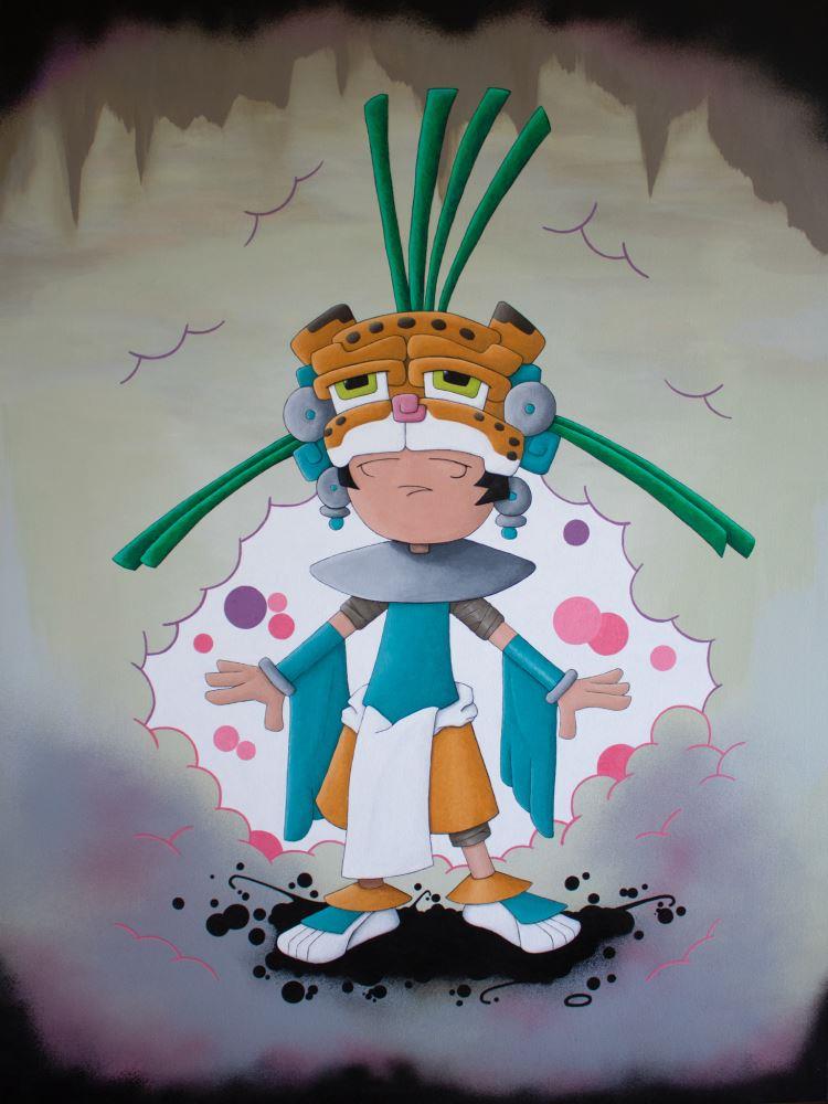 Contemporary art based on Aztec Mythology in a Street/Subway Art style. The stories and adventures of Tupak a young Jaguar Warrior are told within many of my Aztec pieces. This piece is influenced by Aztlan, the starting point of the Aztecs journey to find new lands and a new home.