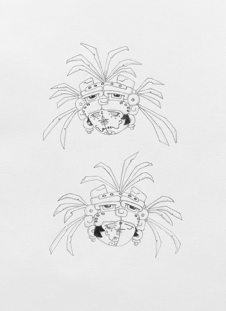 Print of the sketch created for the design of the paintings Tupak: Tzontecomatl of Mictlan and Tupak: Tzontecomatl of Mictlan Again.