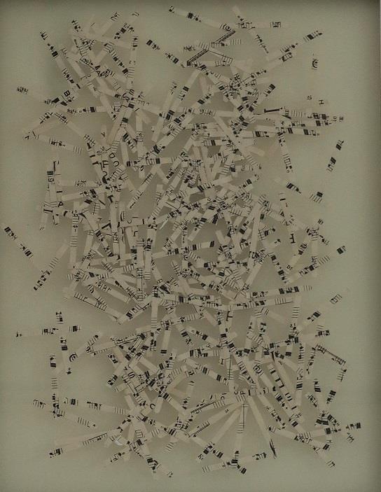 Shredded music has been randomly dropped and scattered between two sheets of glass and suspended over a cream card. The space between the glass and the card allows interesting shadows with different lighting.