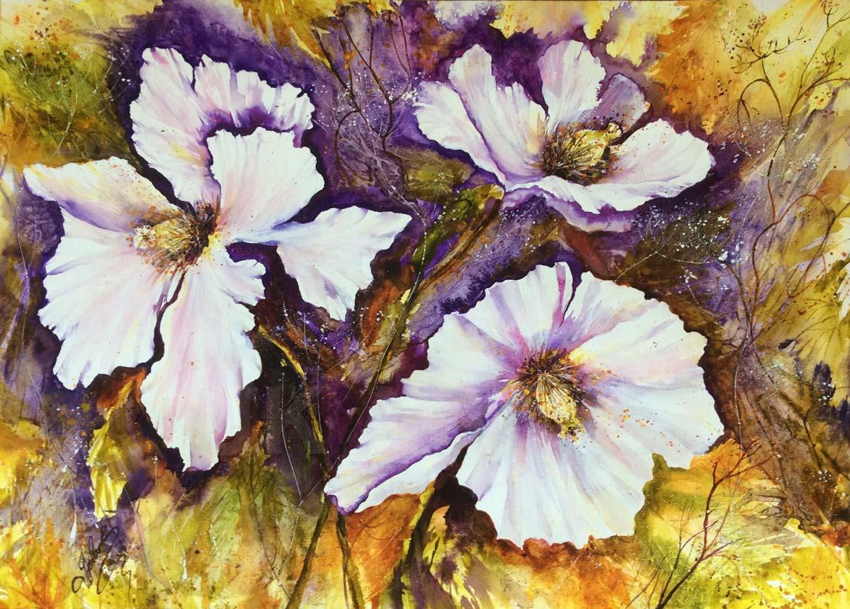 Abstracted gold and purple bright floral painting, very loose and detailed