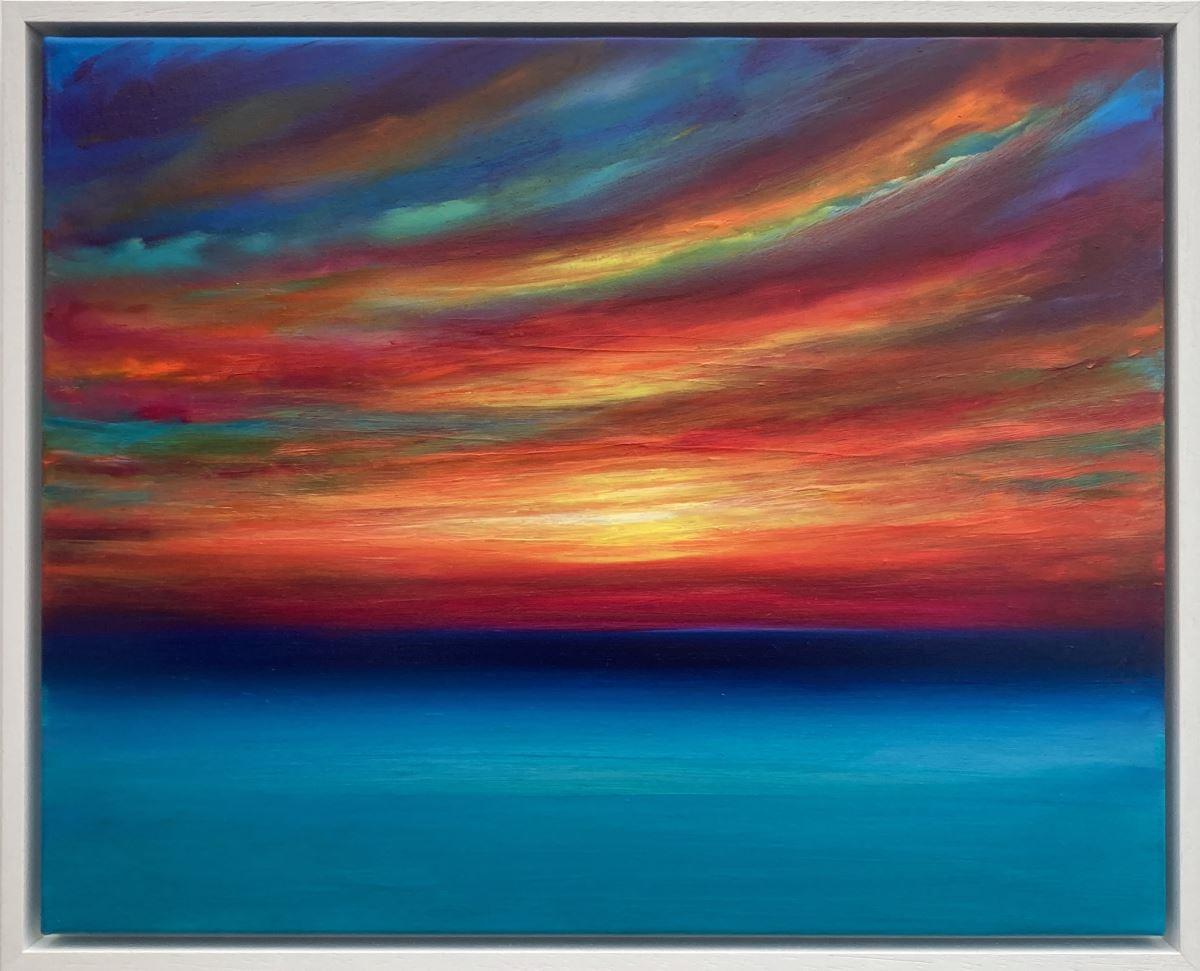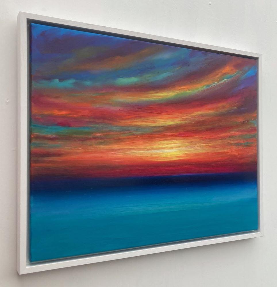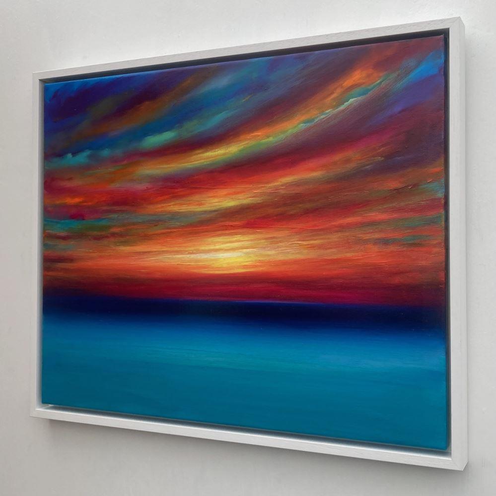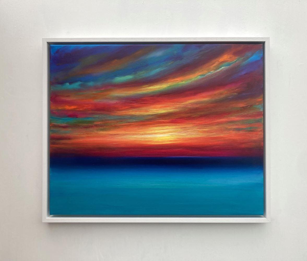 “Electric Night" is a 40x50cm oil on canvas abstract seascape sunset painting on a 2cm deep canvas, mounted in a 43x53x3cm white floating frame. It's ready to hang and comes with a certificate of authenticity.