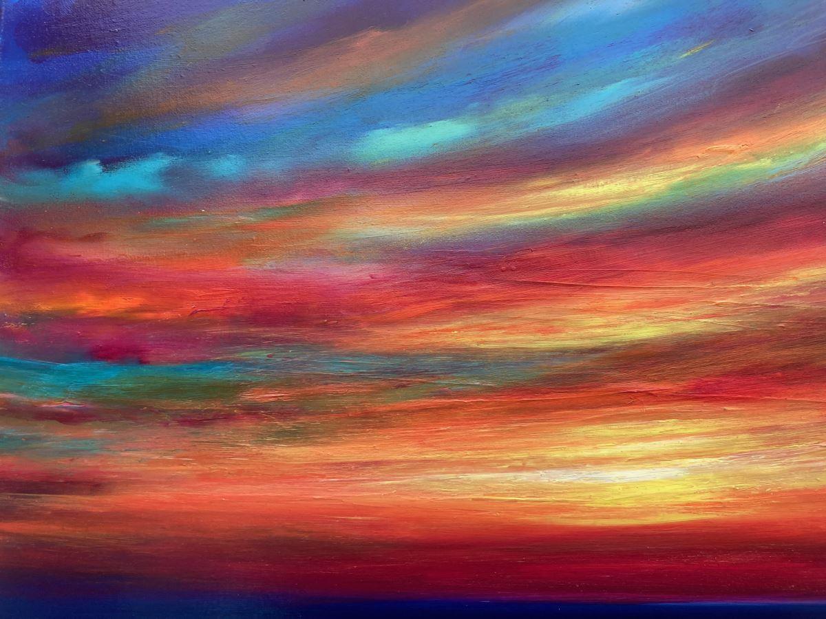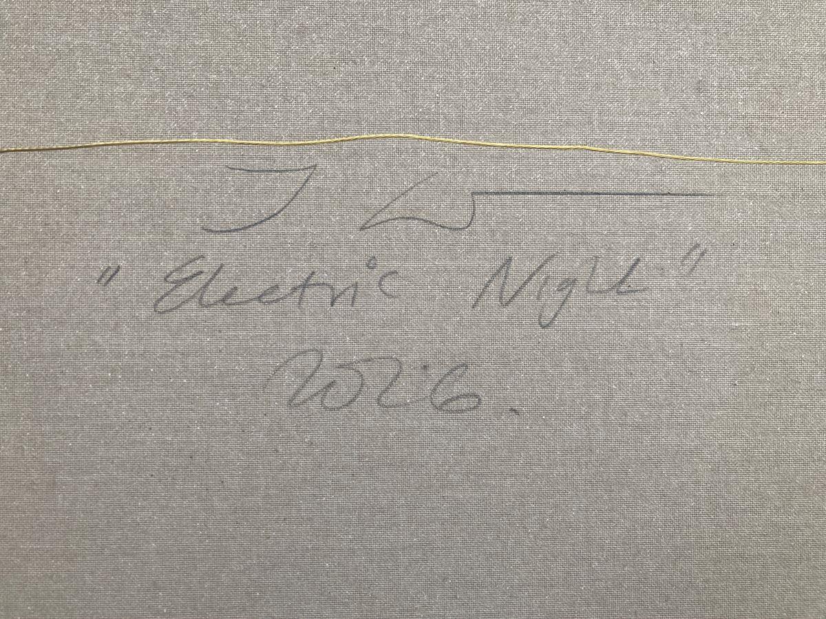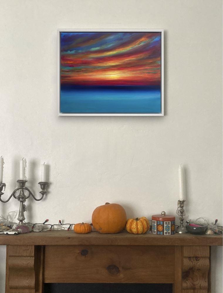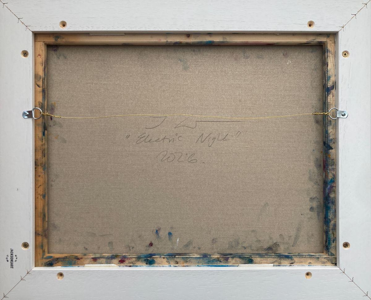 “Electric Night" is a 40x50cm oil on canvas abstract seascape sunset painting on a 2cm deep canvas, mounted in a 43x53x3cm white floating frame. It's ready to hang and comes with a certificate of authenticity.