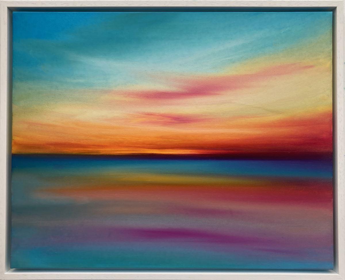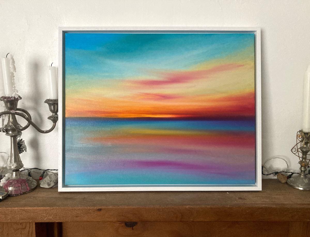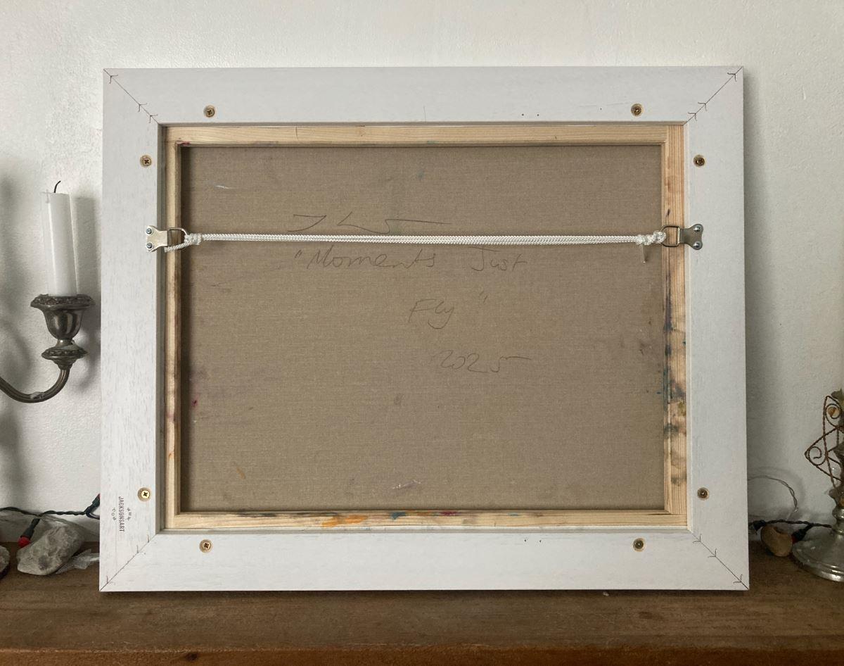“Moments Just Fly" is a 40x50cm oil on canvas abstract seascape painting on a 2cm deep canvas, mounted in a 43x53x3cm white floating frame. It's ready to hang and comes with a certificate of authenticity.