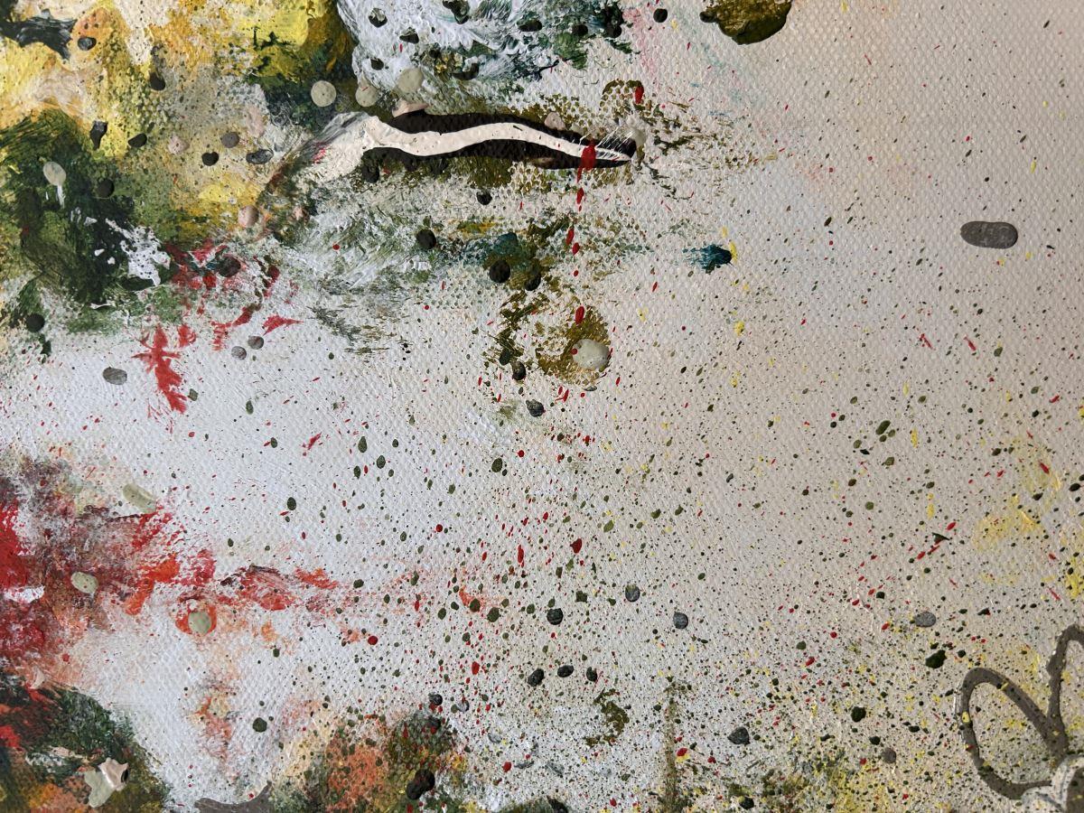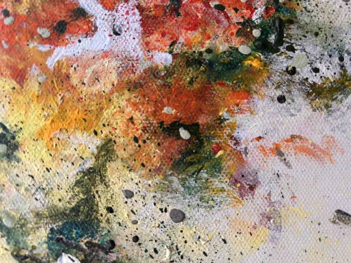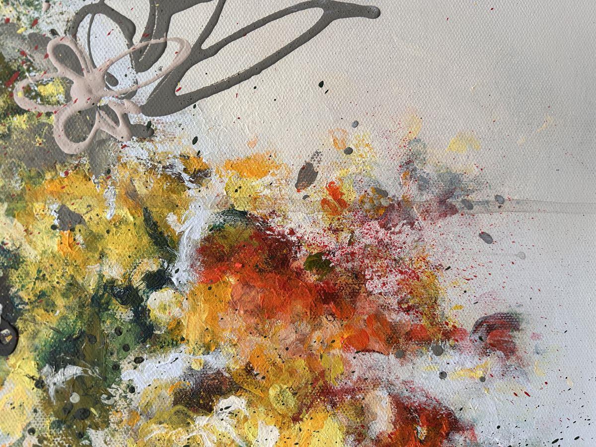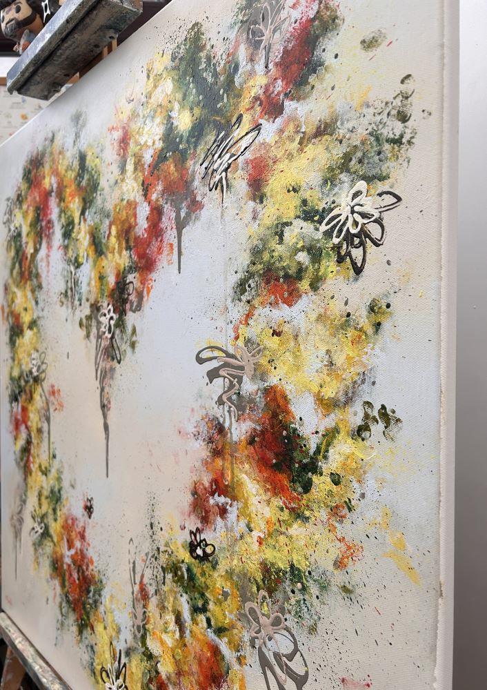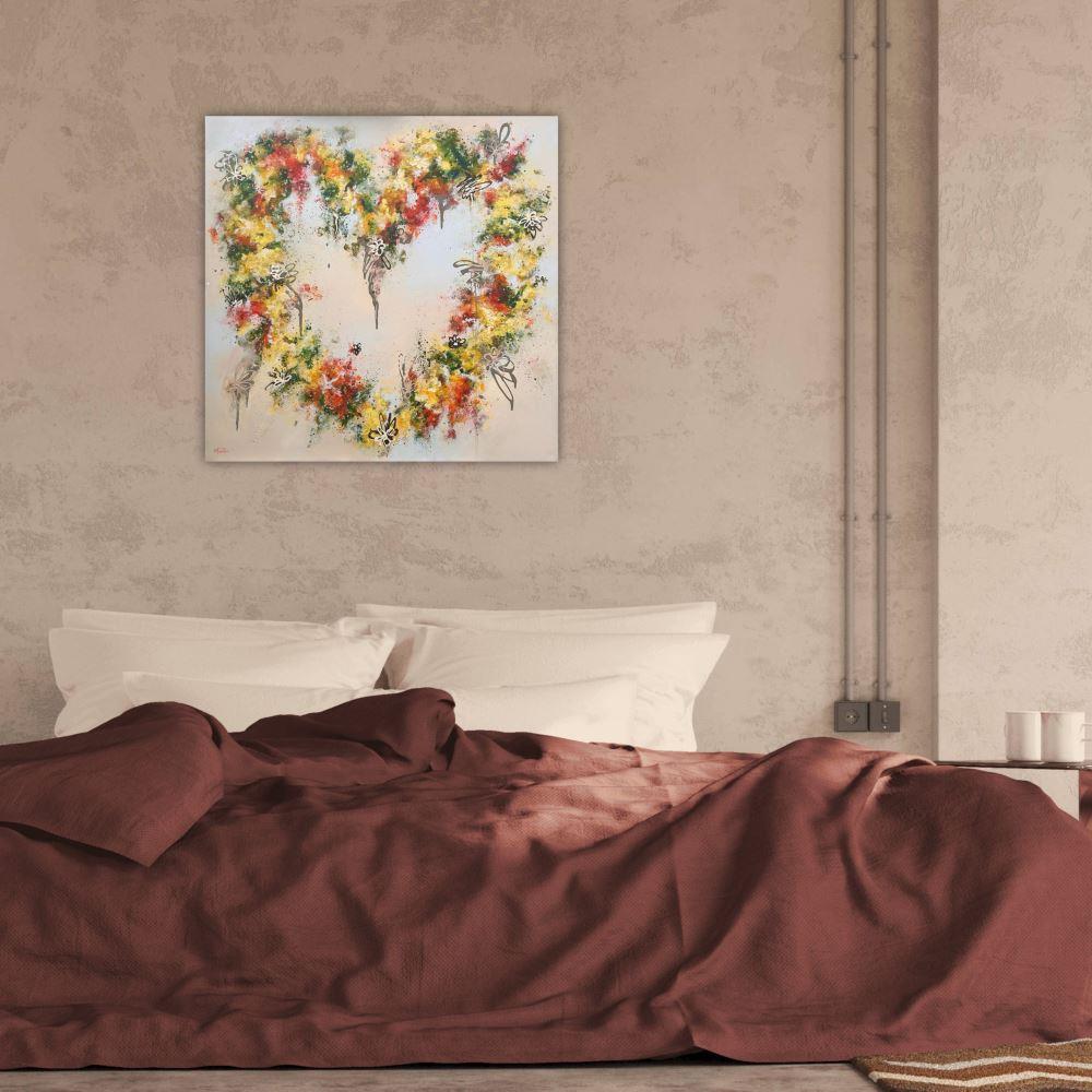 I have always loved hearts and have painted many in the past, however, A GROOVY KINDA LOVE is the first one using my fingers; an intuitive technique whereby the paint feels its way across the canvas in a loose, abstract fashion. Through each layer the leafy greens along with the vibrant orange and yellow flowers appear, creating the beloved symbol of love whilst allowing the blooms to evolve organically.