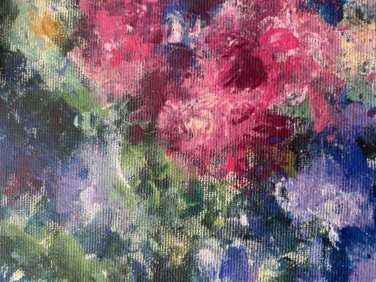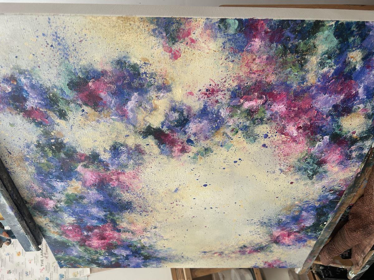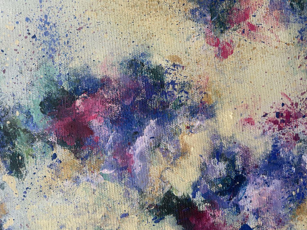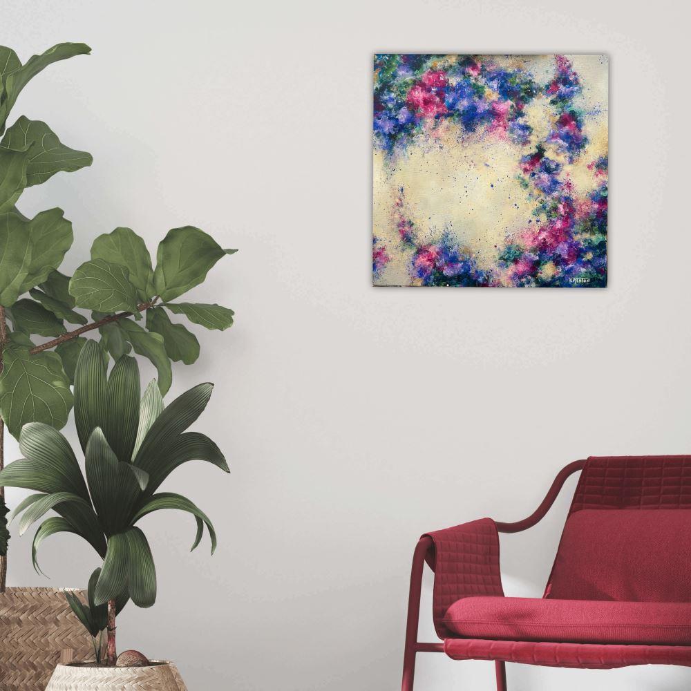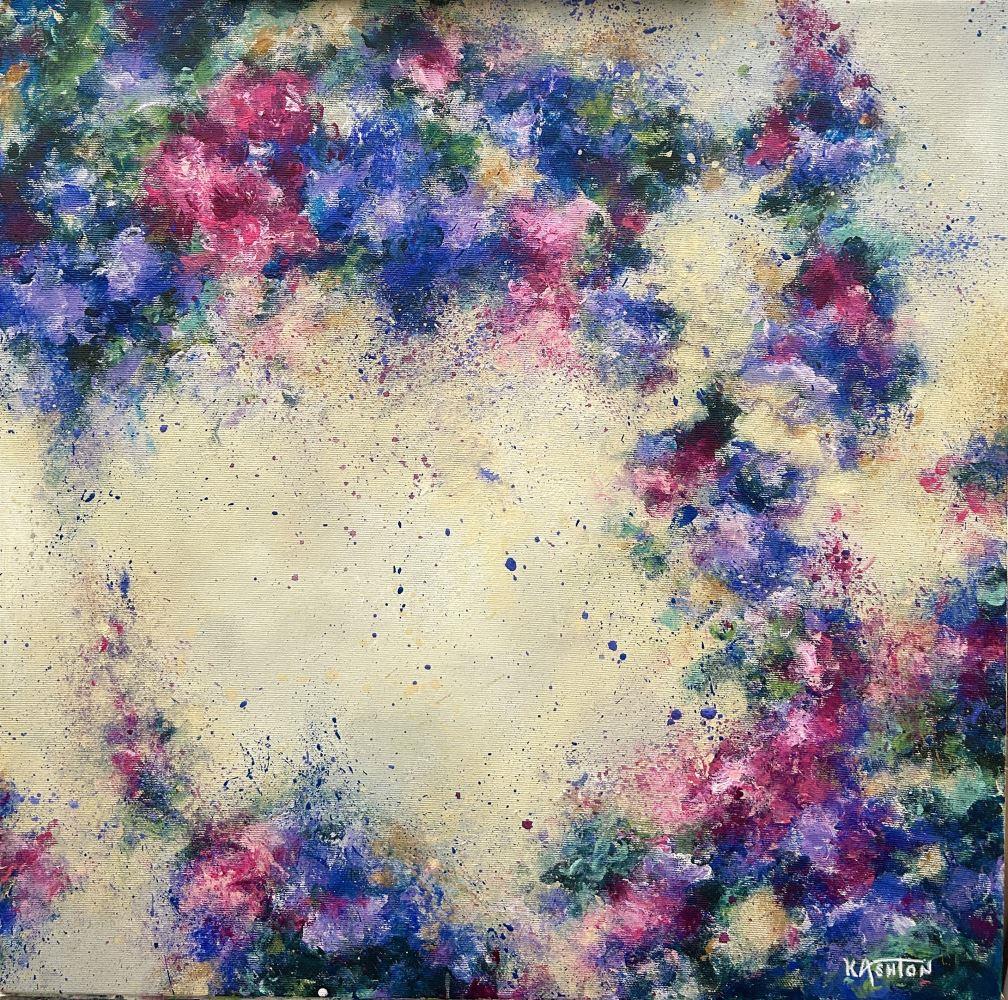 AMONGST FRIENDS was created mostly with my fingers, an intuitive technique whereby the paint feels its way across the surface in a loose, abstract fashion. Through each layer the flowers emerge, creating movement and unpredictability, allowing the painting to evolve organically.