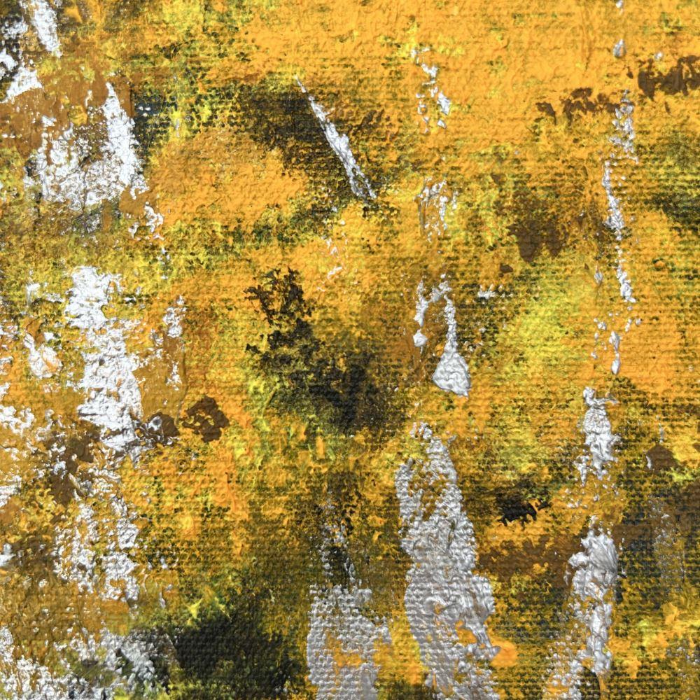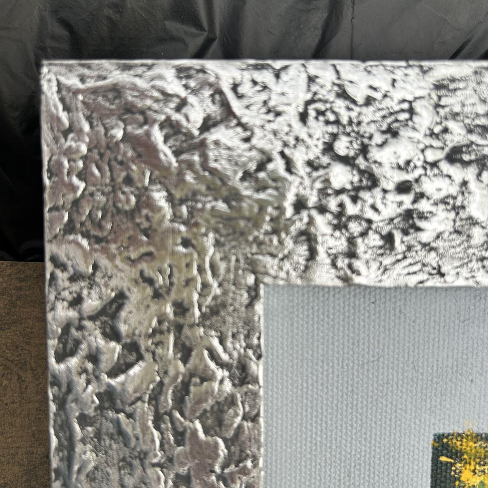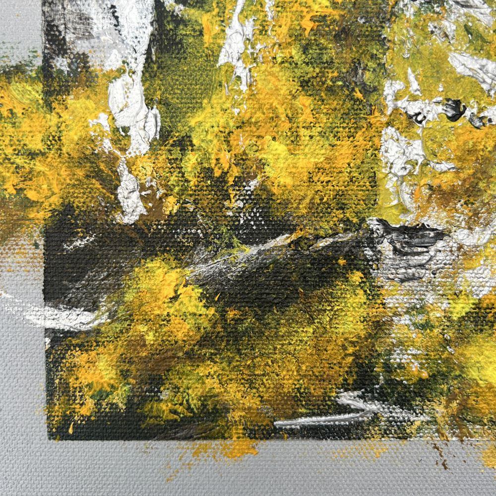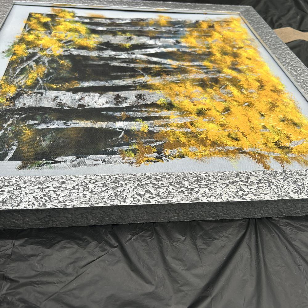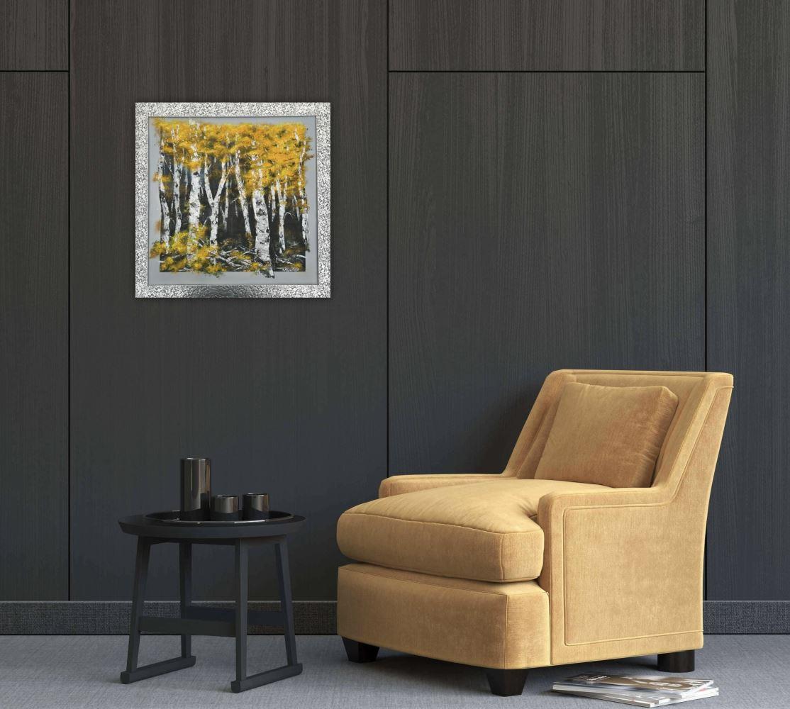 Palette knife textured acrylic painting of autumn silver birches. This piece comes framed in a sturdy textured silver moulding.