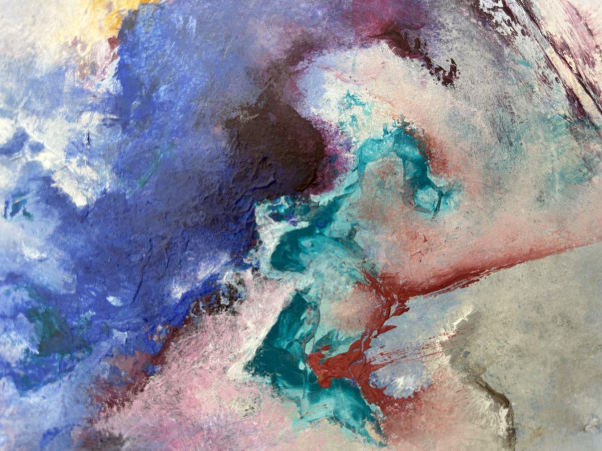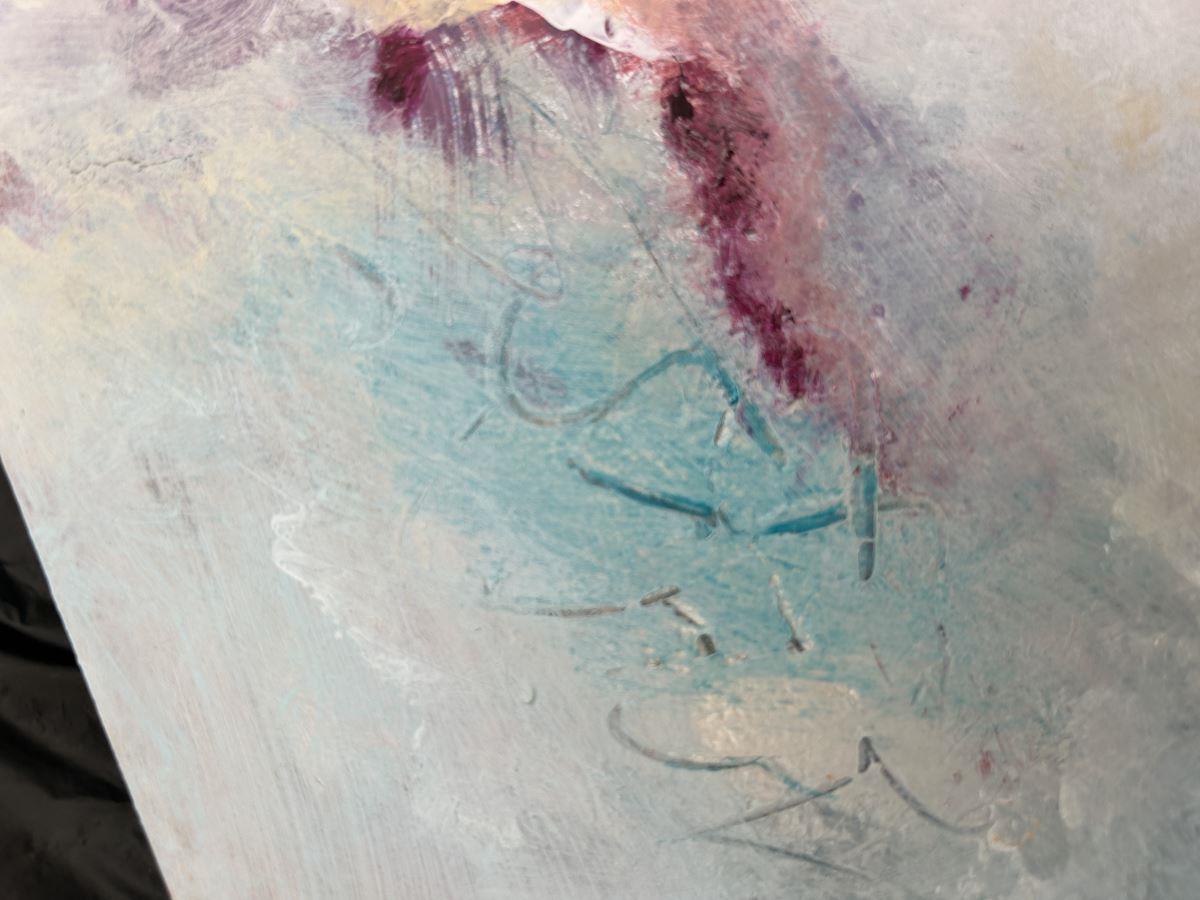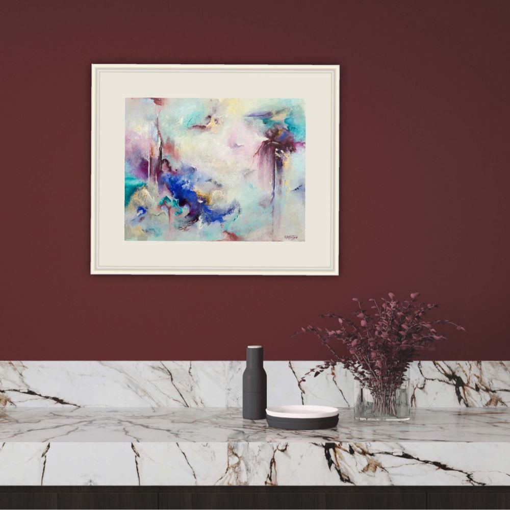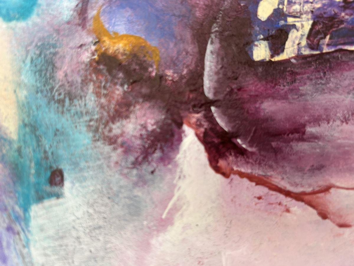 Dreamy abstract piece in beautiful muted purples, pinks and turquoise.