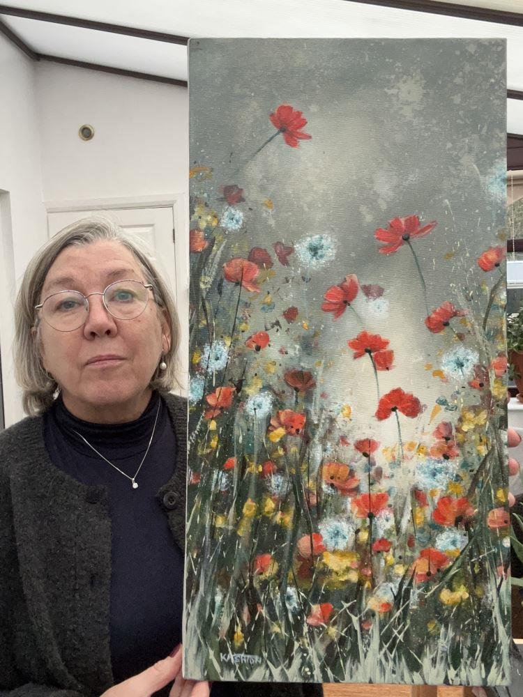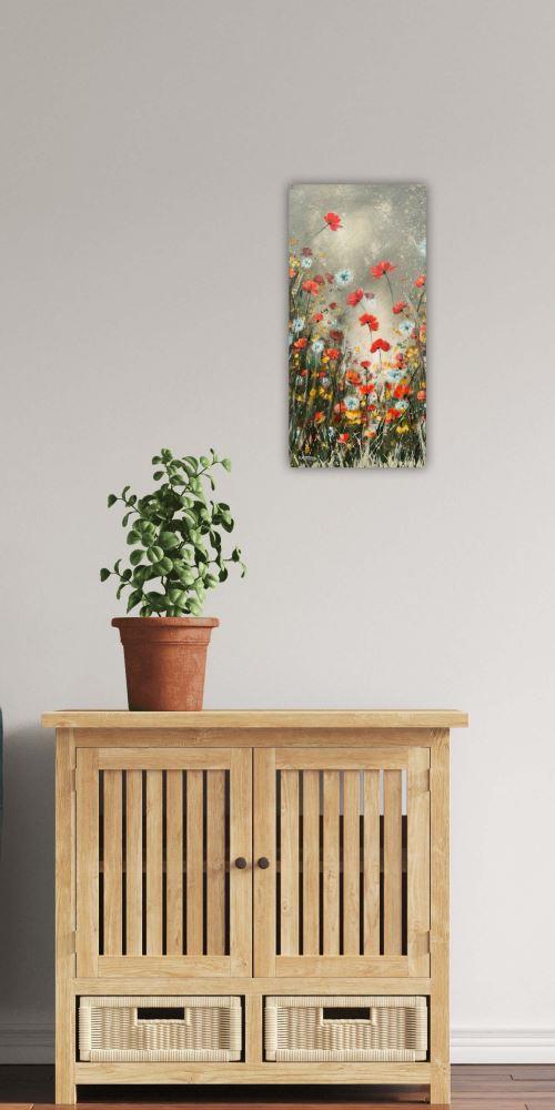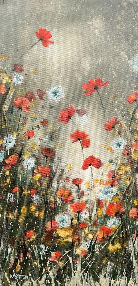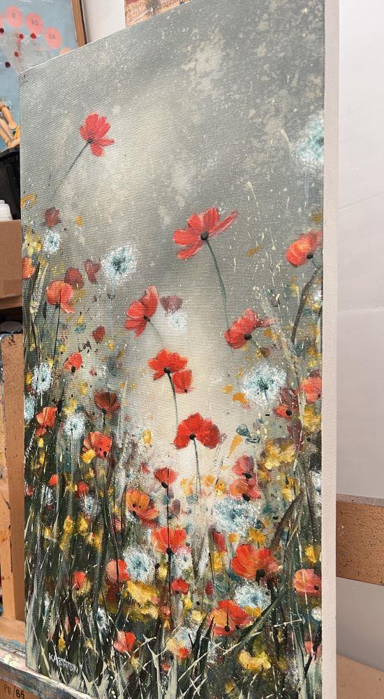 FIRST LIGHT was created with an array of tools from brushes, bottles and fingers (an intuitive technique whereby the paint feels its way across the surface in a loose, abstract fashion). Through each layer the colourful wildflowers emerge, creating movement and unpredictability, allowing the painting to evolve organically.