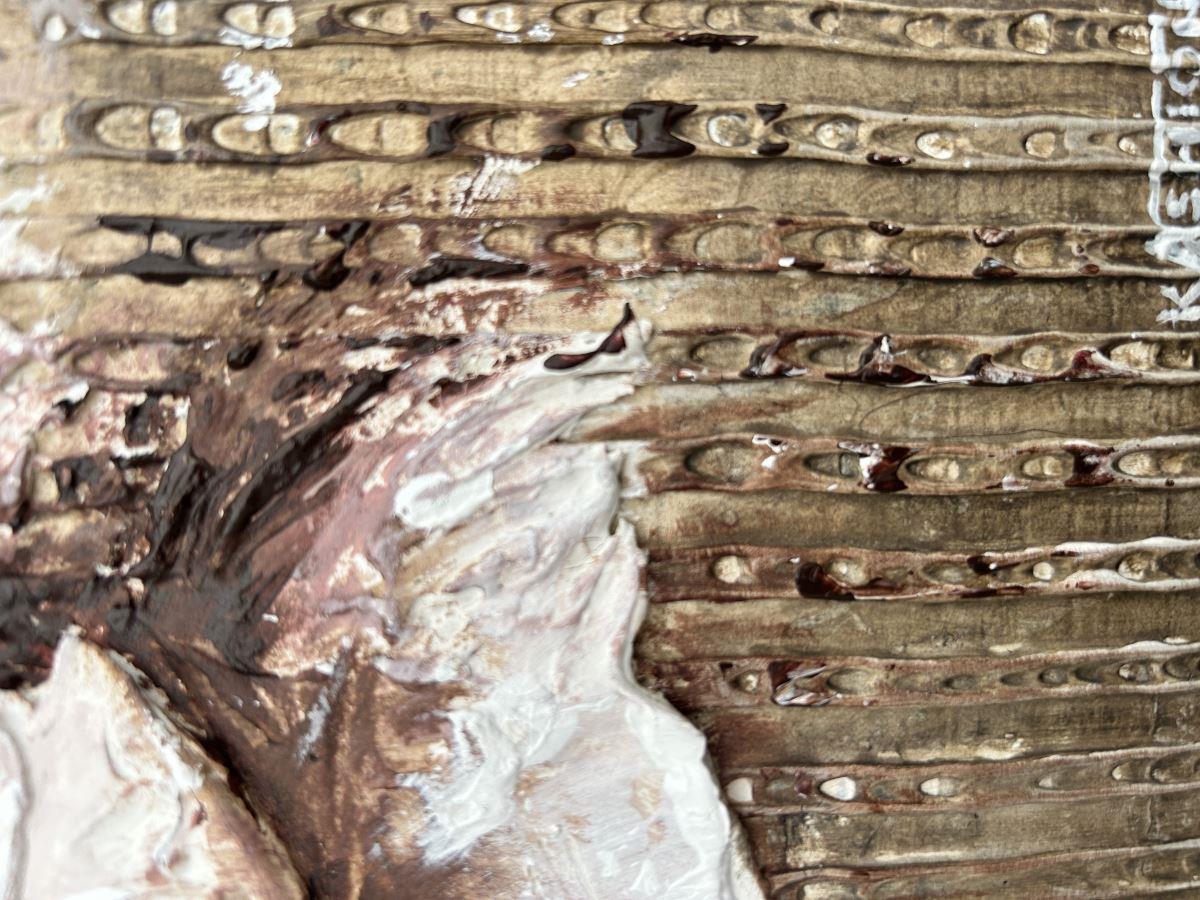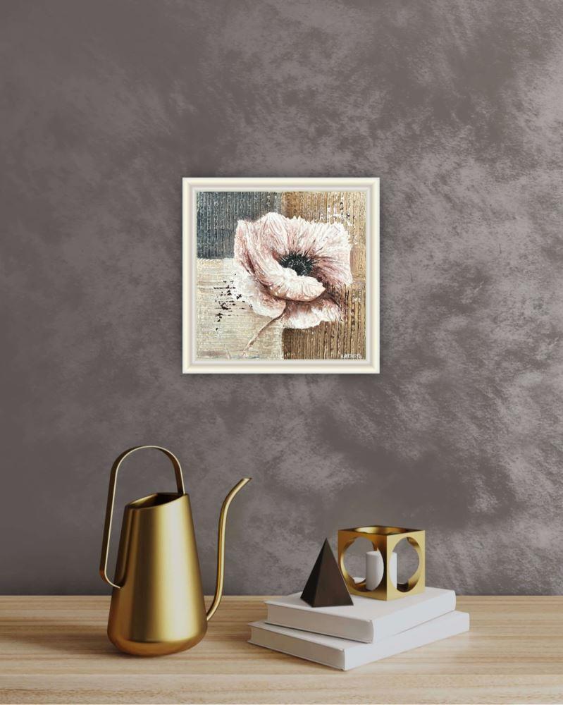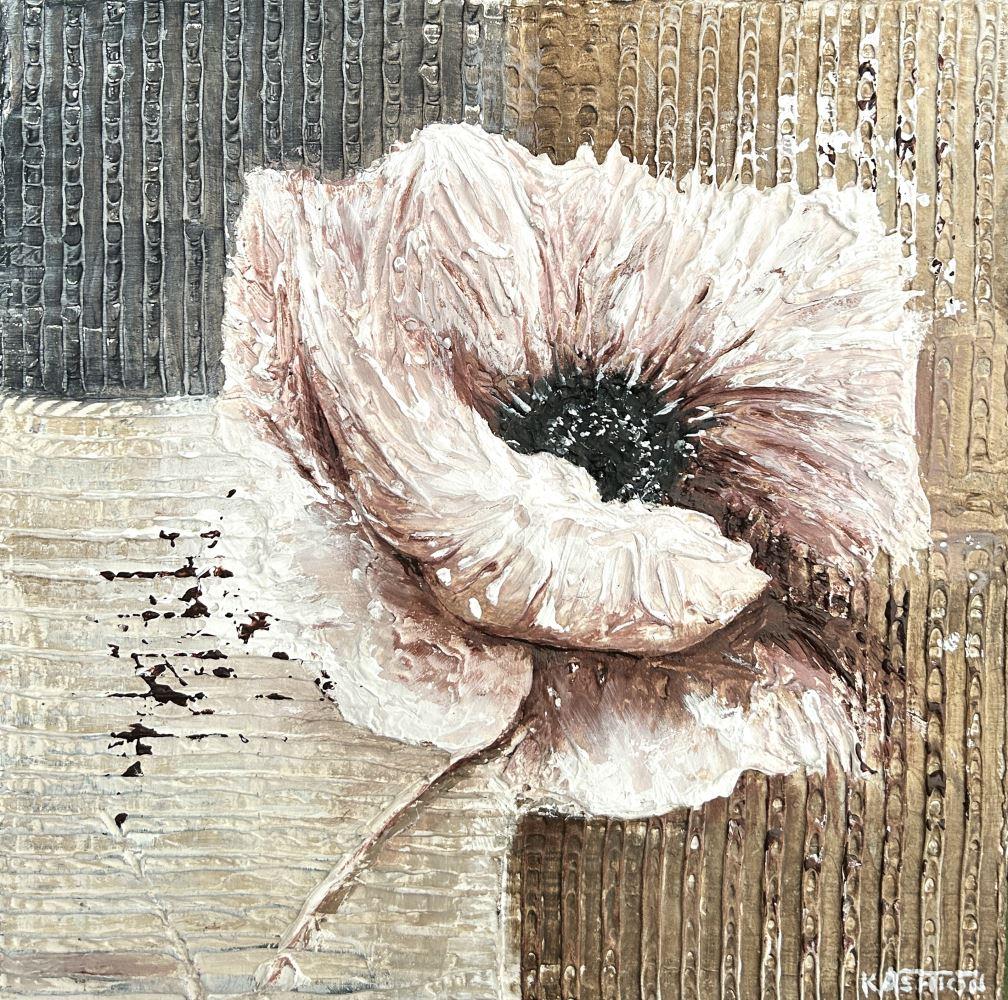 A tactile, abstract piece in neutrals created with palette knives and joint compound (a sort of moulding plaster) which makes for wonderful texture. The loose, flowing petals of the poppy stand out against the rigid geometric background; all wonderful to the touch.