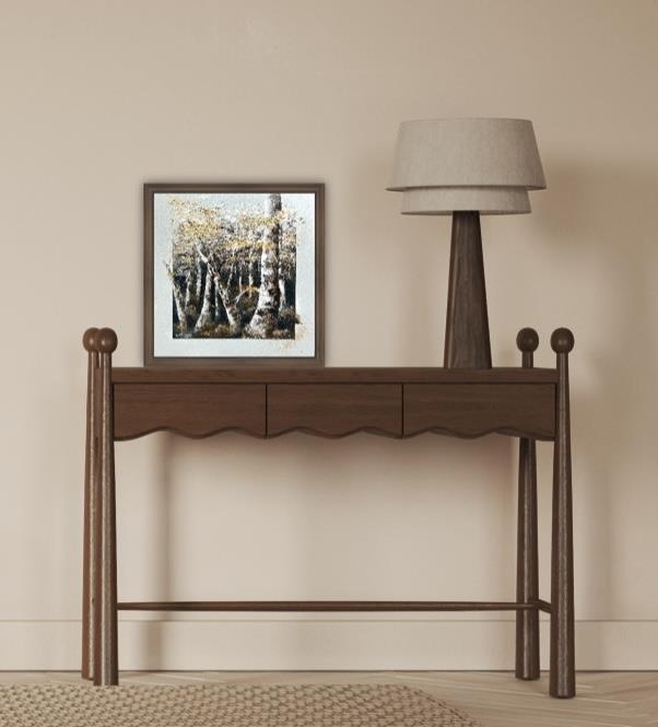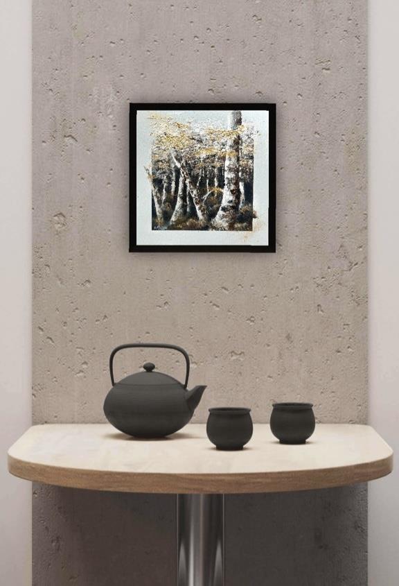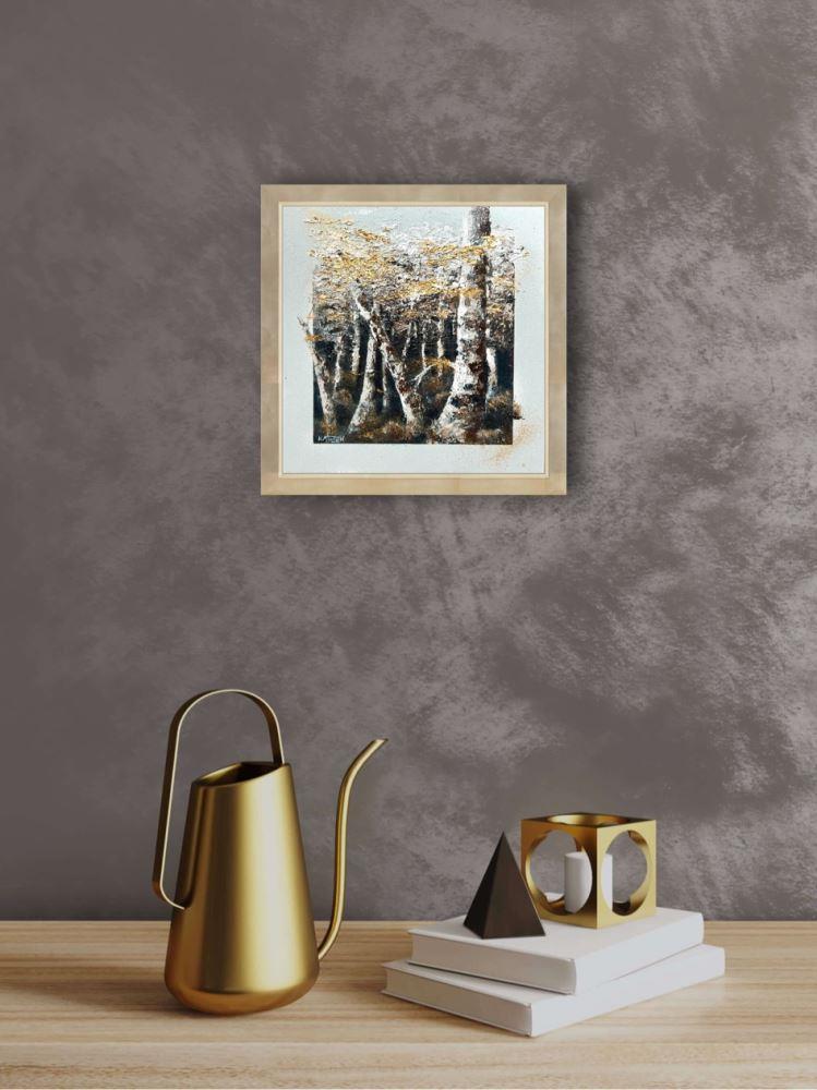 If you have a small space to fill, then this small textured acrylic painting of birch trees in monochrome tones with luminous gold leaf might just fit the bill.