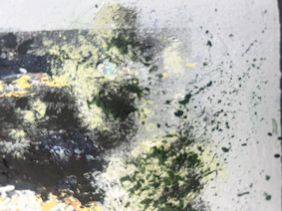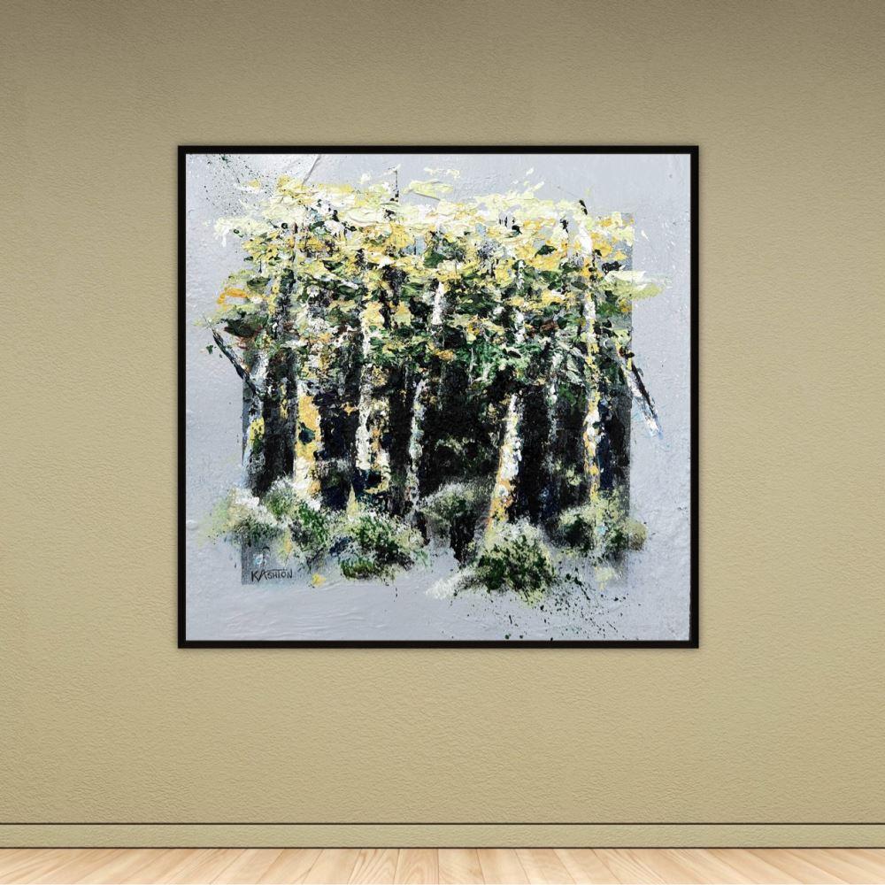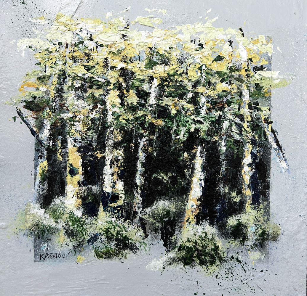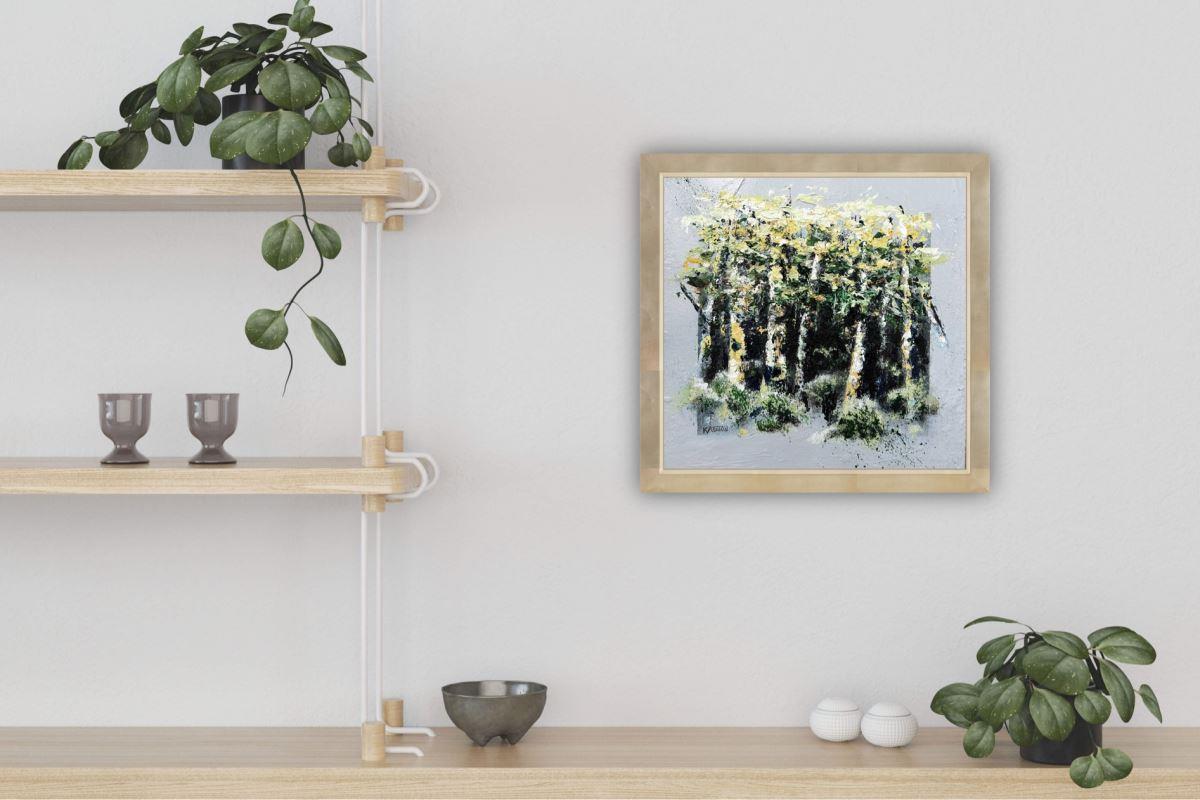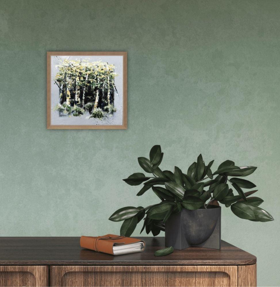 If you're looking for a miniature piece to fill a small spot, then this small textured acrylic painting of spring birch trees might be just what you're looking for. As well as the texture created with the palette knife, there is subtle texture around the incorporated 'frame' for added interest.