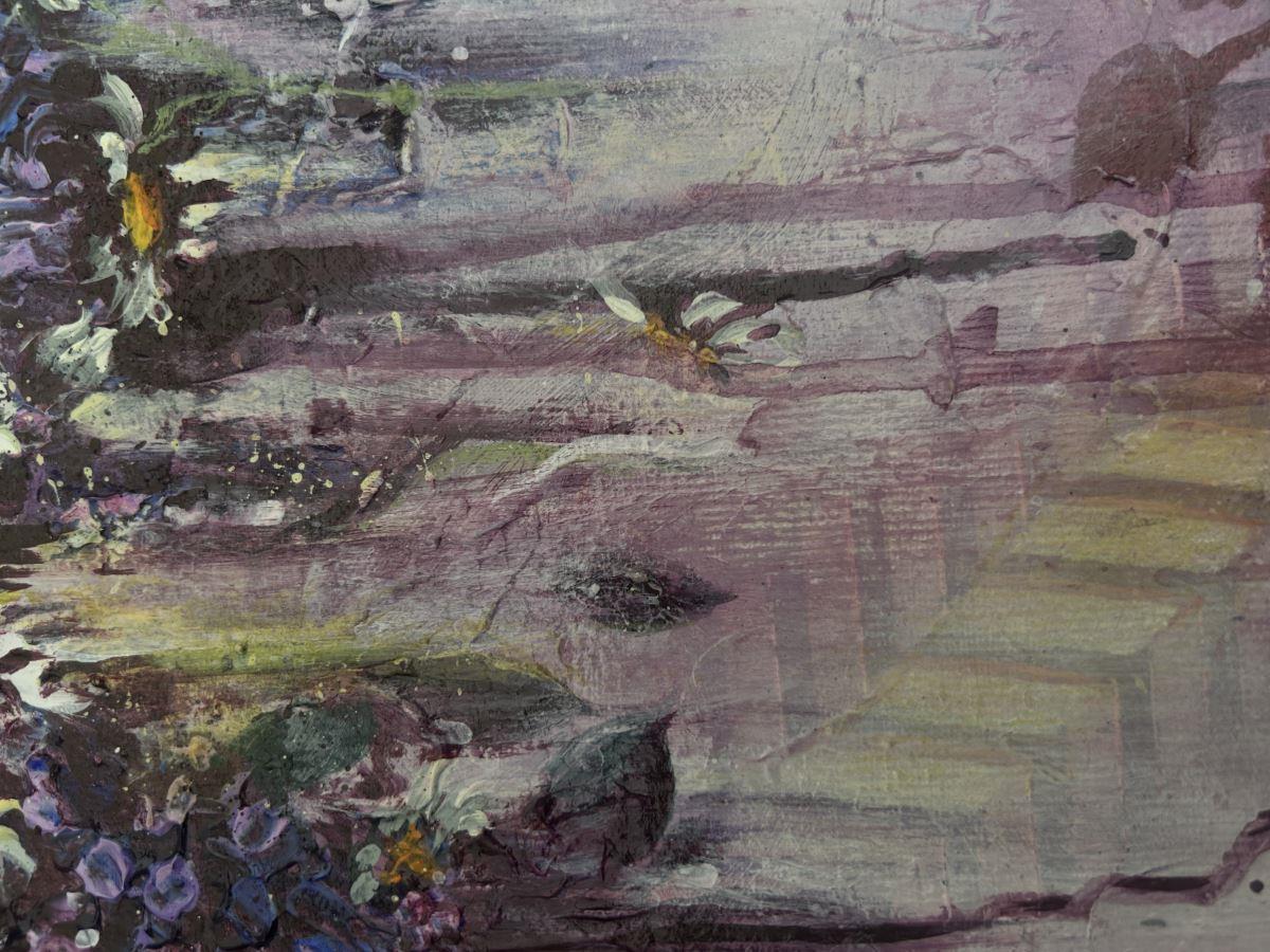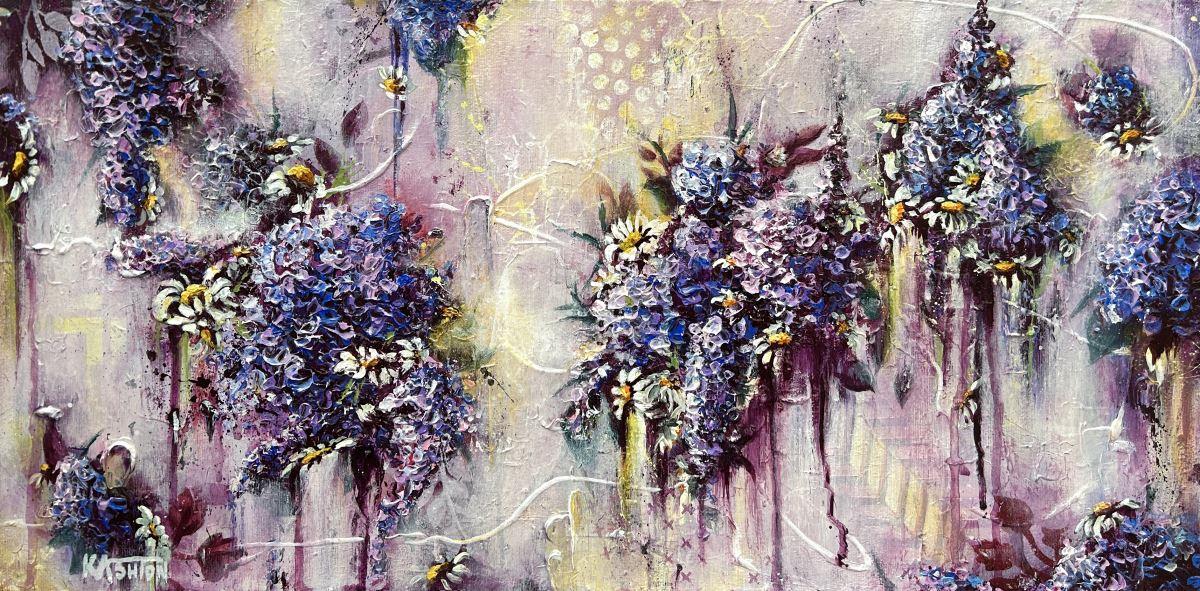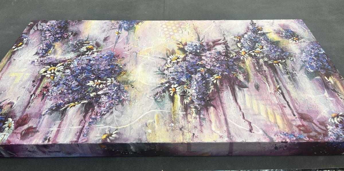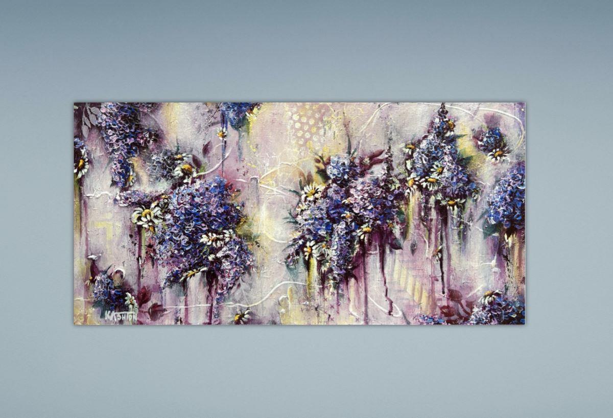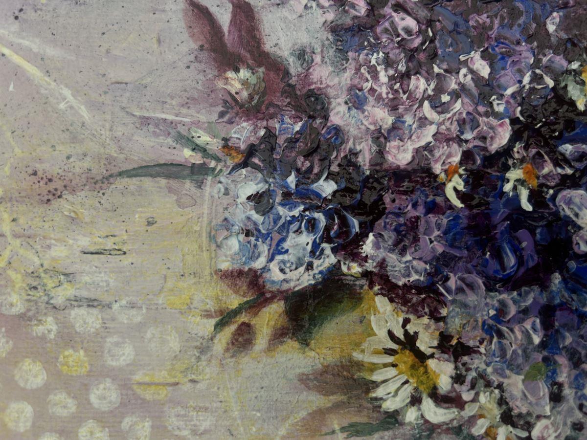 Textured semi-abstract lilacs and daisies in beautiful blues and purples, lilacs and yellows created with palette knives on a small panoramic box canvas. Aside from the eye-catching blooms, there's some subtle textures going on in the background, adding further interest to the piece.
