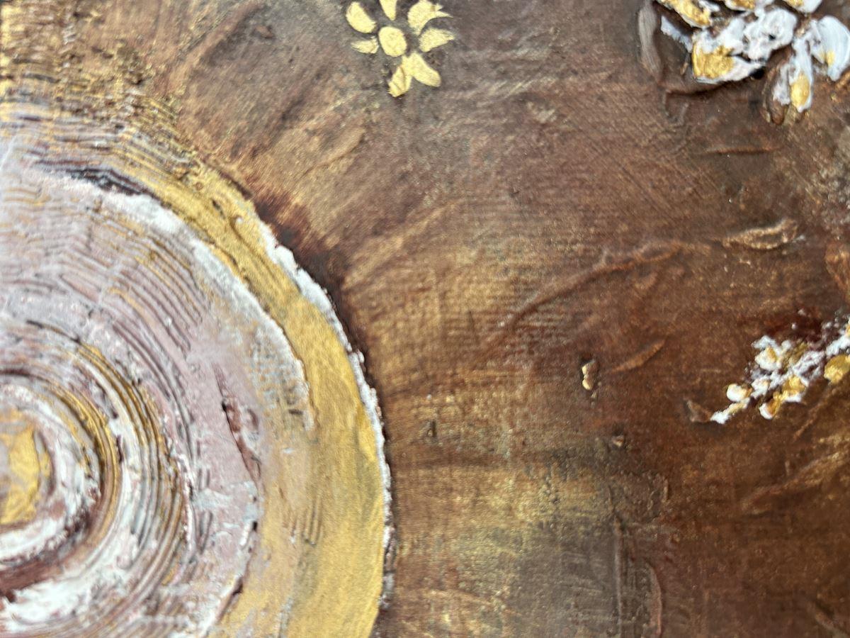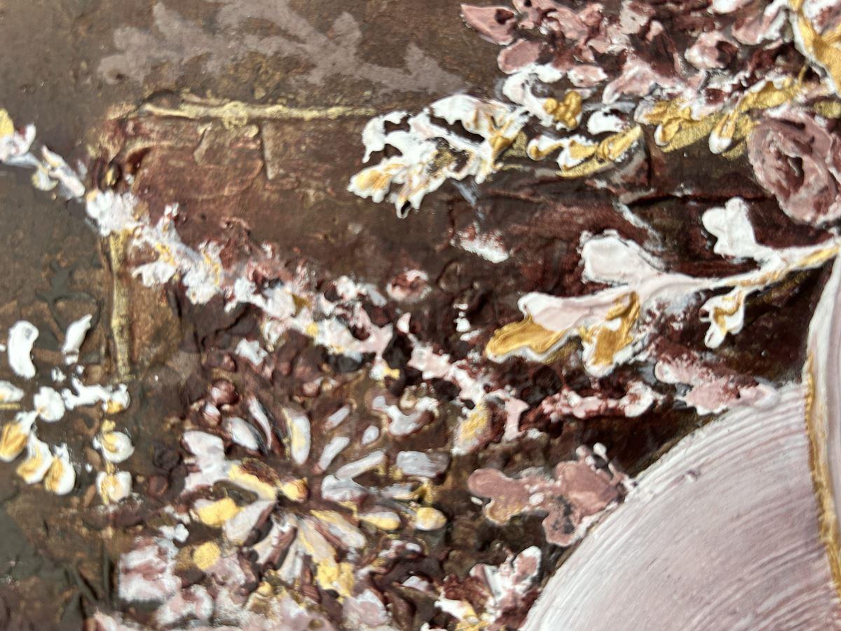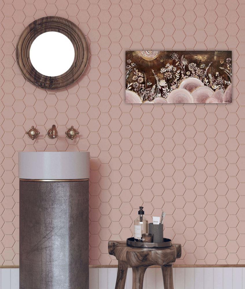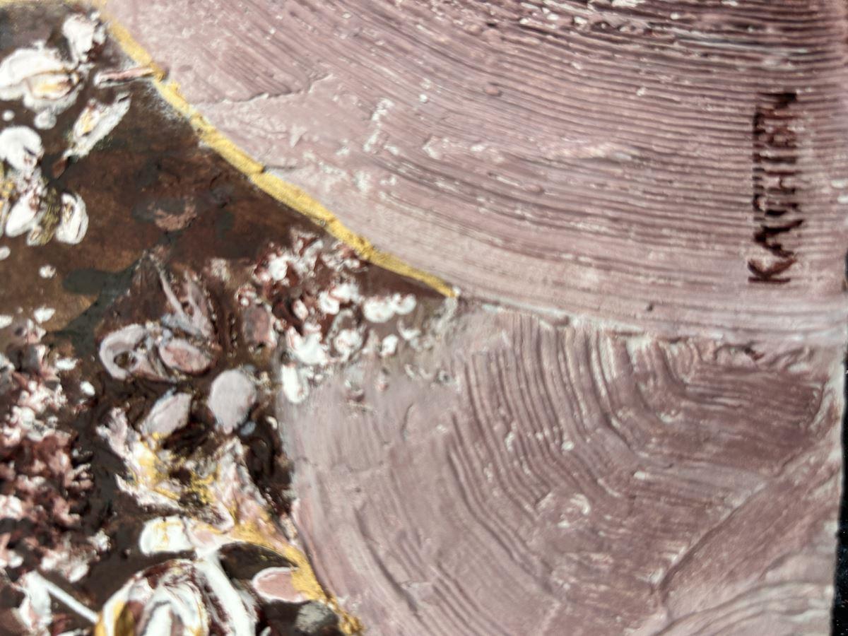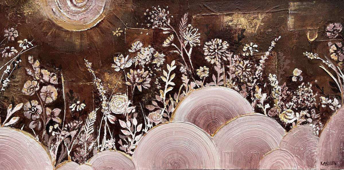 A wide semi-abstract landscape painting in mixed media in dusky pinks, warm browns and bronze. I liked the idea of textured flowers over the hill, catching the sun and generally living their best lives together.