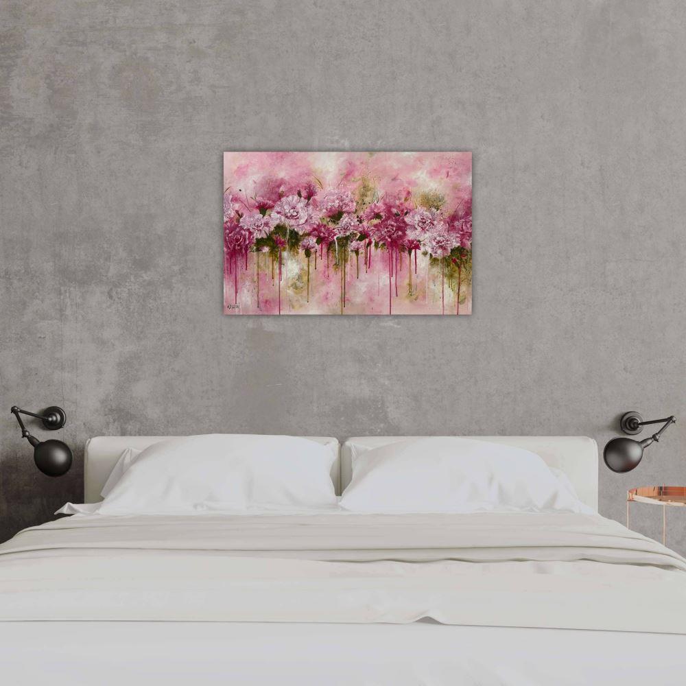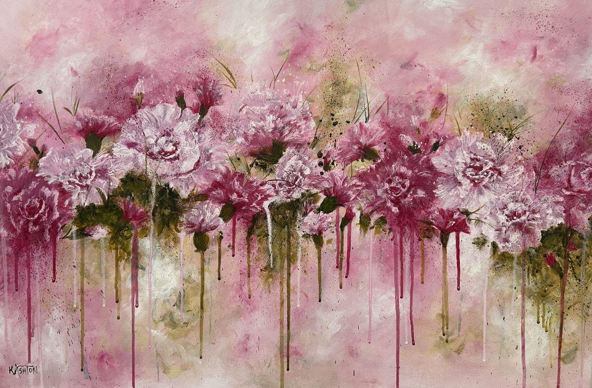 Tickled Pink is a painting that was created using a multitude of tools including silicone brushes and my fingers. I allow my intuition to lead the way during this organic process and as layer upon layer is added, my fingers dance and swirl all over the canvas. This large semi-abstract piece celebrates the humble carnation which is one of my favourite flowers. I would surround myself with these blooms if I could and always have a vase of them nearby. They are so beautiful.