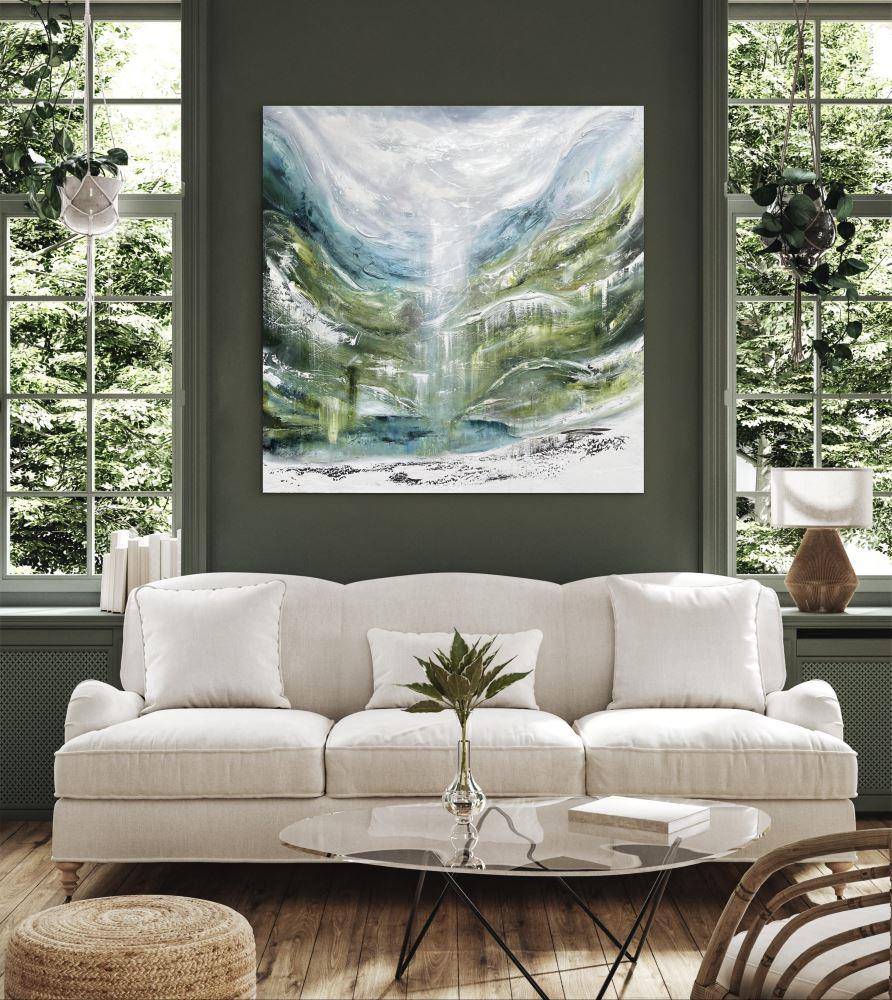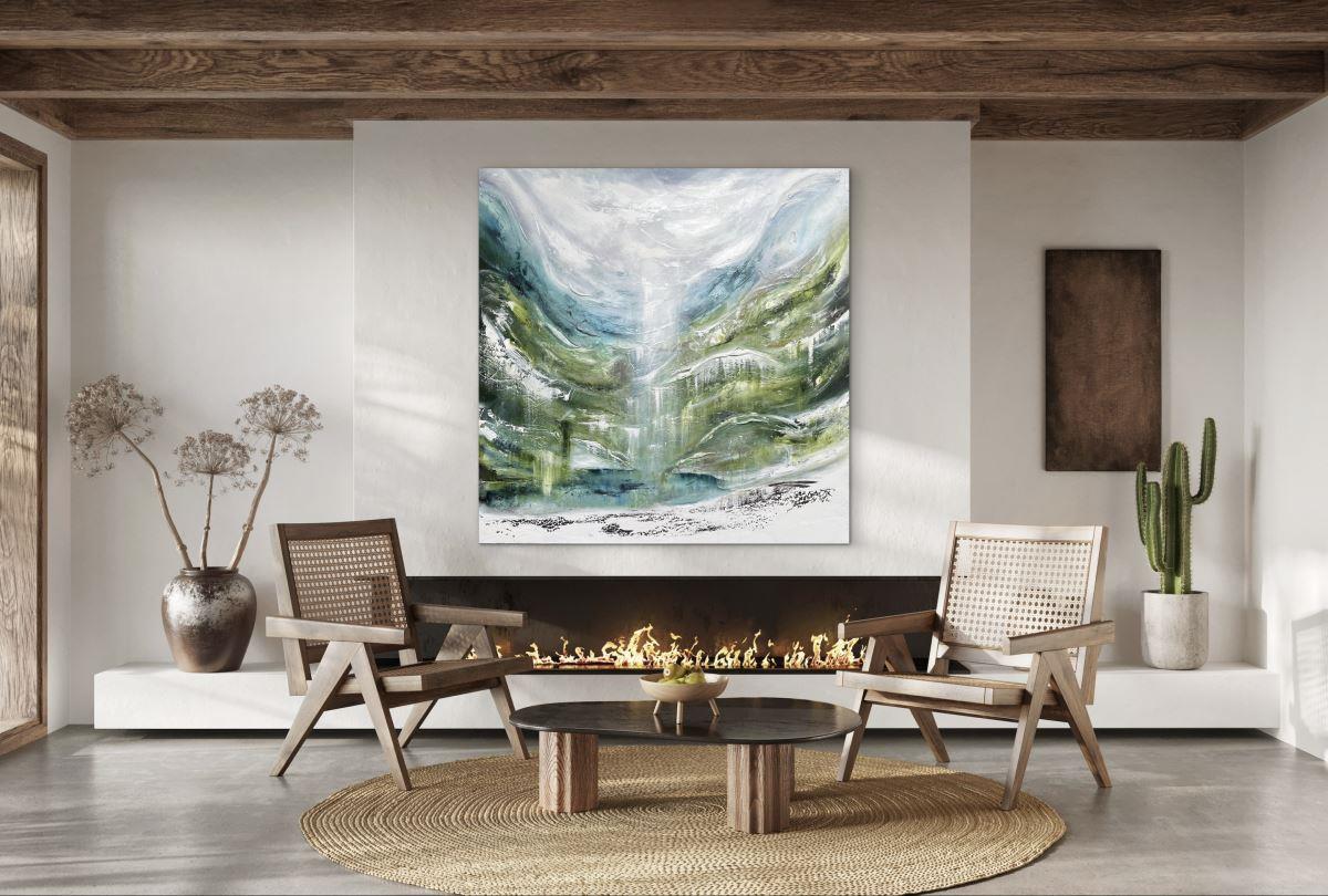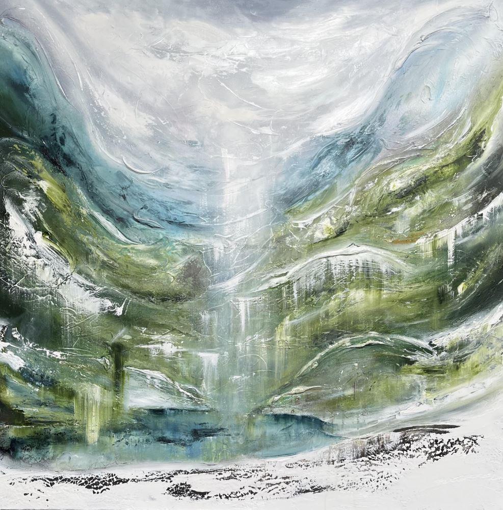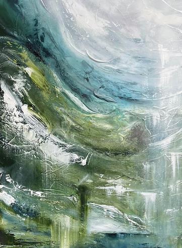 Fluid tones of green, whites, and blue evoke the icy waters with the rugged beauty of nature. Layered textures create a sense of depth and dimension, blending ethereal hues with bold strokes.