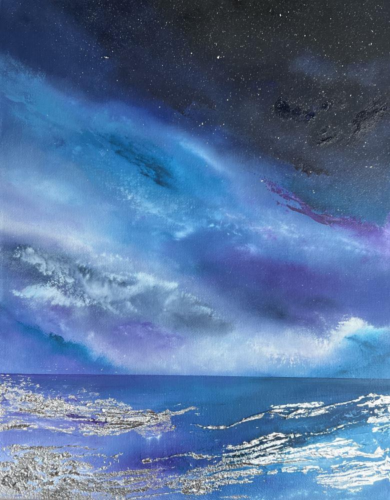 Celestial Dreams is a small oil painting that explores the liminal space between seascape and cosmos. The composition present a quiet horizon where expansive and atmospheric skies dissolve into a tranquil body of water, rendered in layered tones of deep indigo, ultramarine and soft violet.