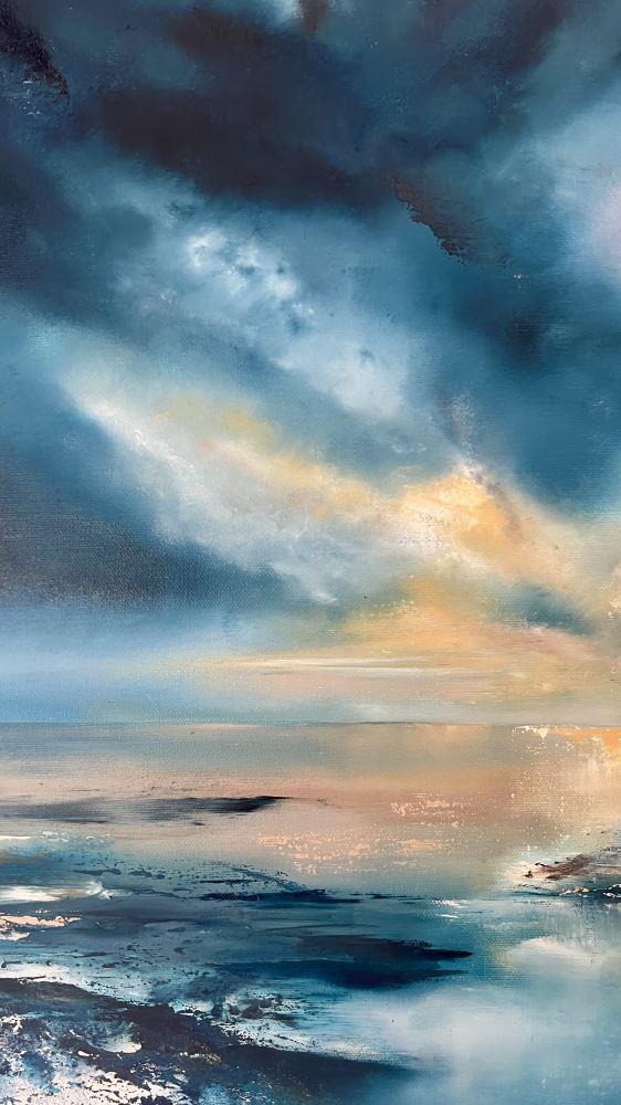 The artwork reflects this volatile environment through sweeping, expressive brushstrokes and a palette of deep ocean blues, icy whites, and flashes of golden light breaking through the storm. These elements suggest both the danger and the fleeting calm that define this remote wilderness.