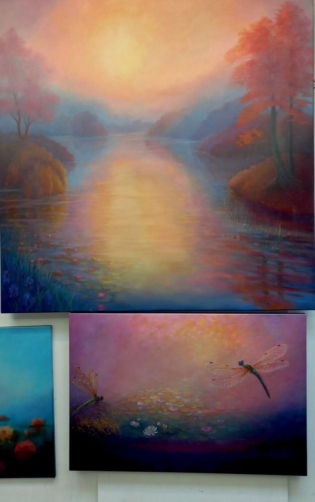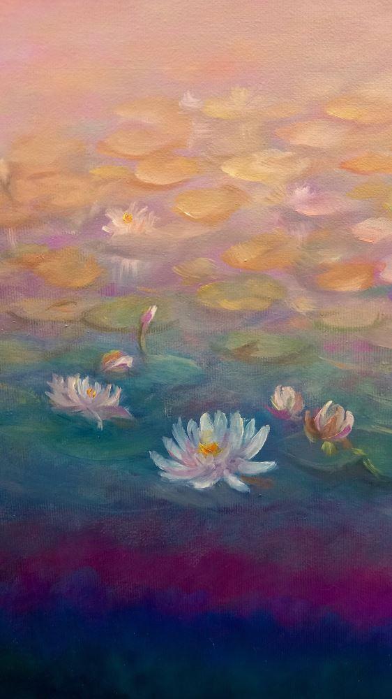 Two dragonfies with waterlilies on a pink/gold impressionistic background. Metallic pigments on wings and foliage.