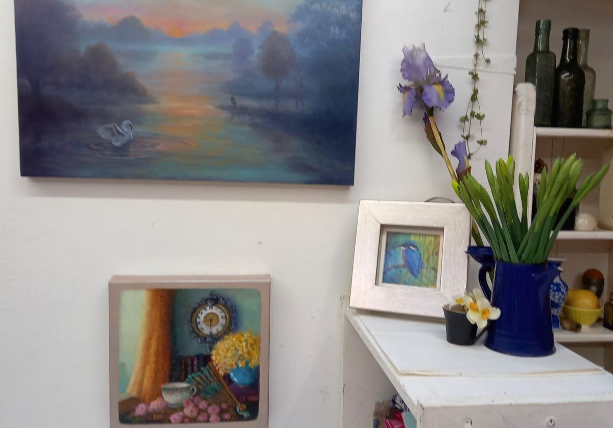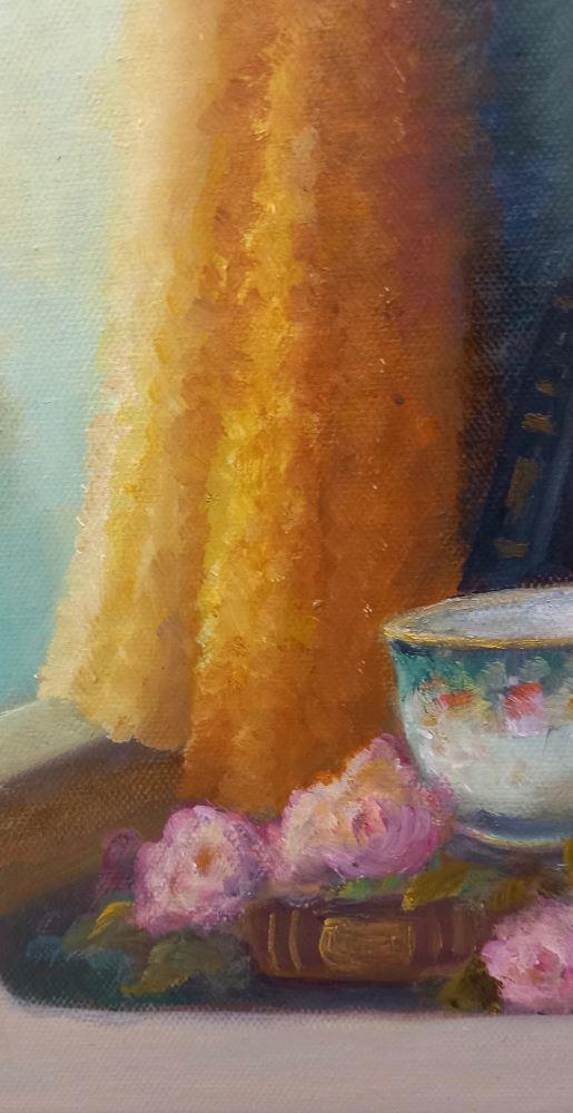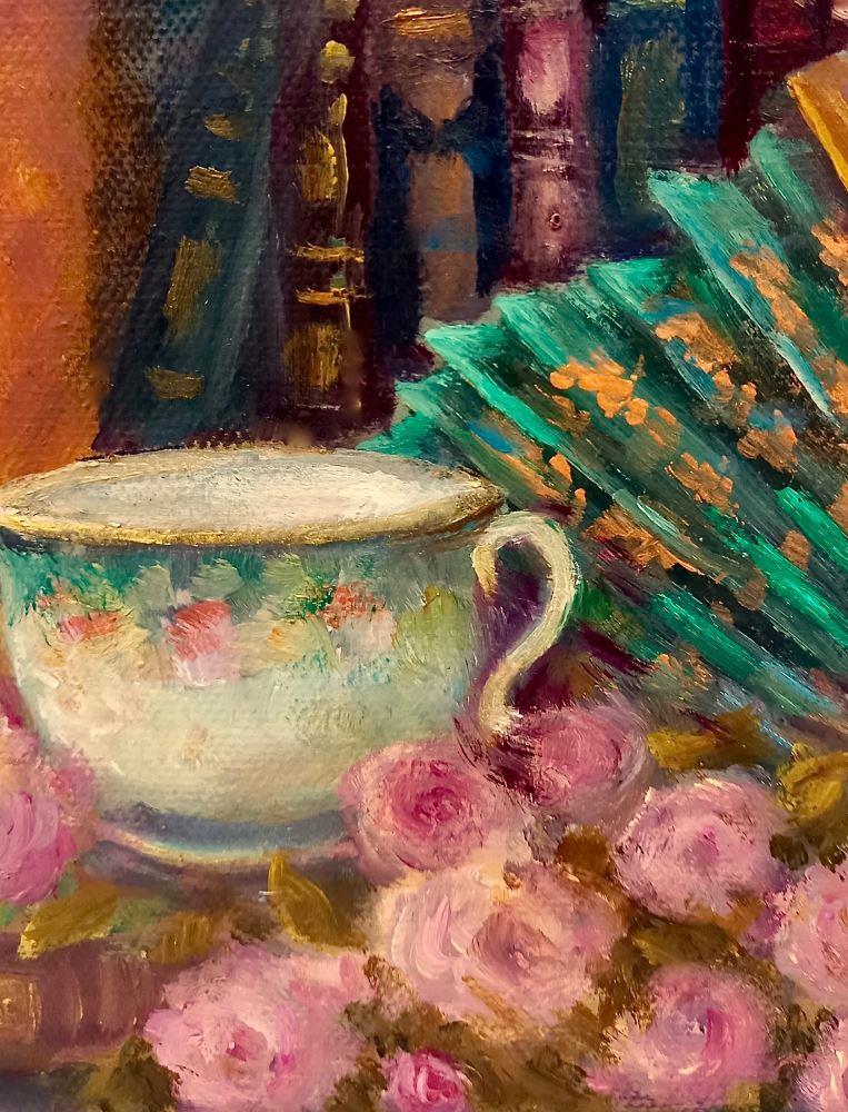 A dance of time and tranquility. Using rich oils, symbolising moments of reflection—a vintage clock, soft flowers, and an elegant cup evoke nostalgia and serenity. I wanted to bring a warm, peaceful energy to your space, inviting calm and contemplation through every brushstroke. This piece transforms any room into a quiet sanctuary where time feels beautifully suspended. Silvery metallic edges which continue around the sides so no frame required.