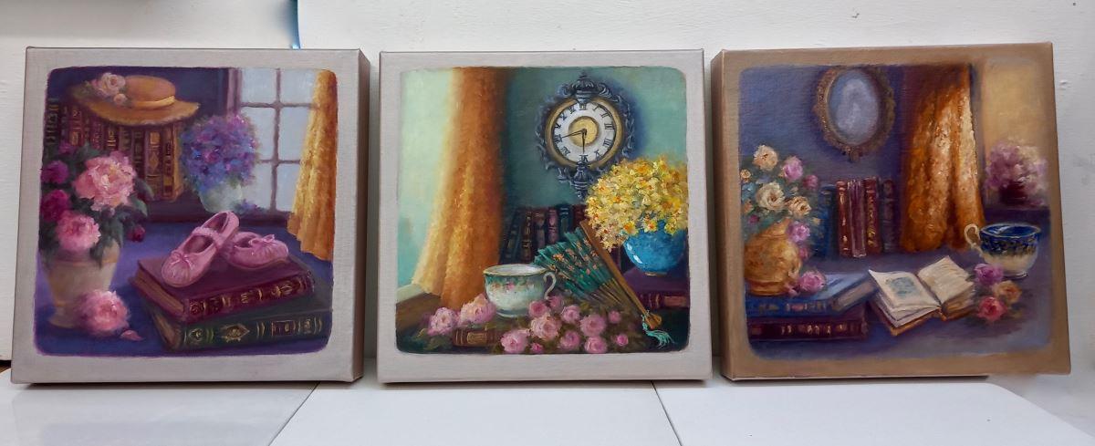A peaceful reflective still life with a straw hat and tiny pink ballet shoes resting on antique books framed by a gold lace curtain with a vase of peonies. Metallic silvery edges which continue around the edges so no frame required.