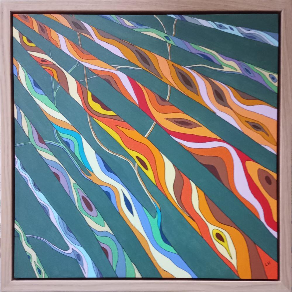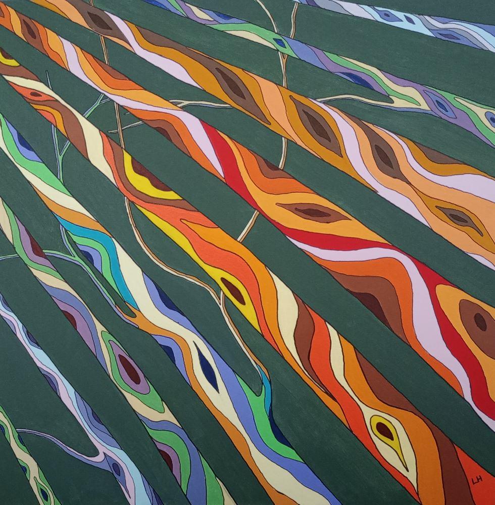 A dreamy abstract landscape depicting a canopy of multicoloured trees in a dark forest. The swirling patterns on the tree trunks lend a magical feeling to the scene.