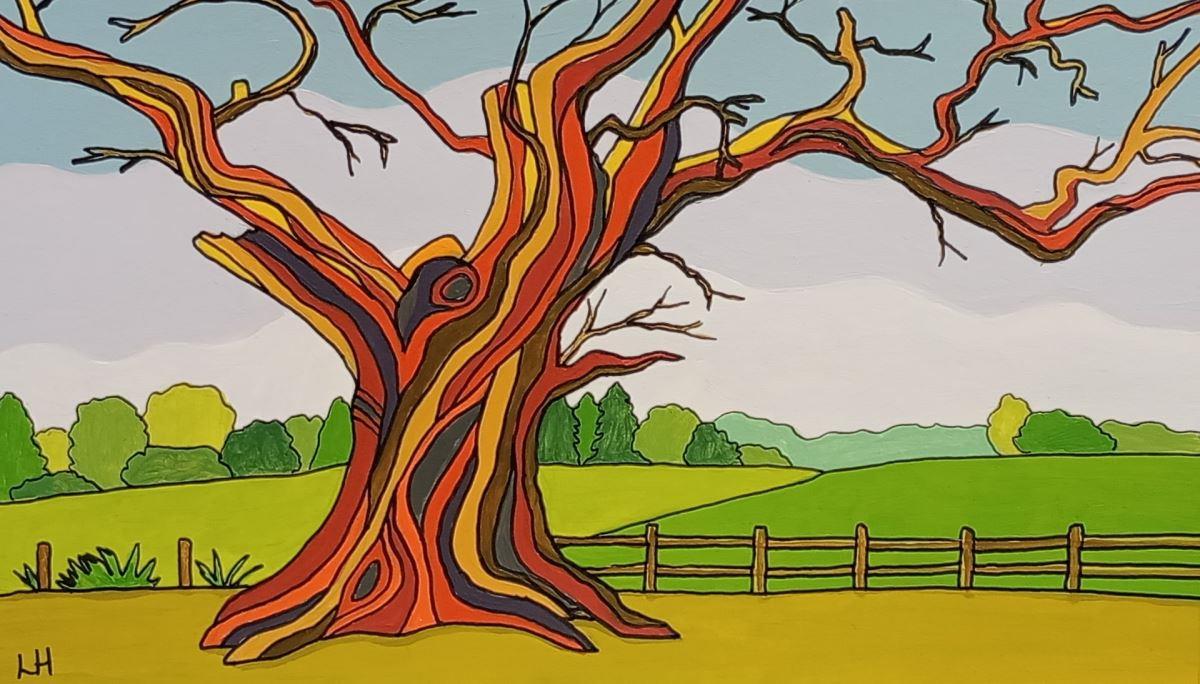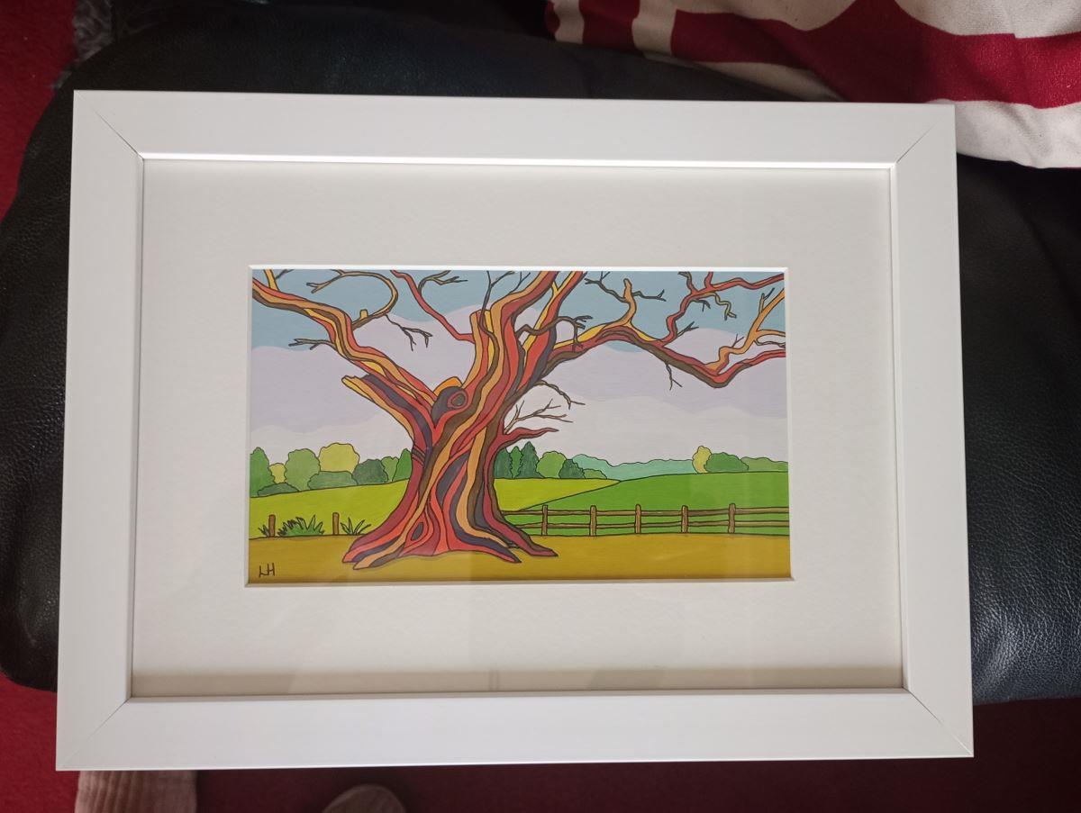 Colourful original painting of an old gnarled tree on a background of rolling green fields. Painted in acrylics with ink outlines on A4 acrylic paper, mounted and framed. The frame is white wood and includes real glass, with title and artist signature on the back. The painting was inspired by a walk in the grounds of Thoresby Hall, Nottinghamshire.
