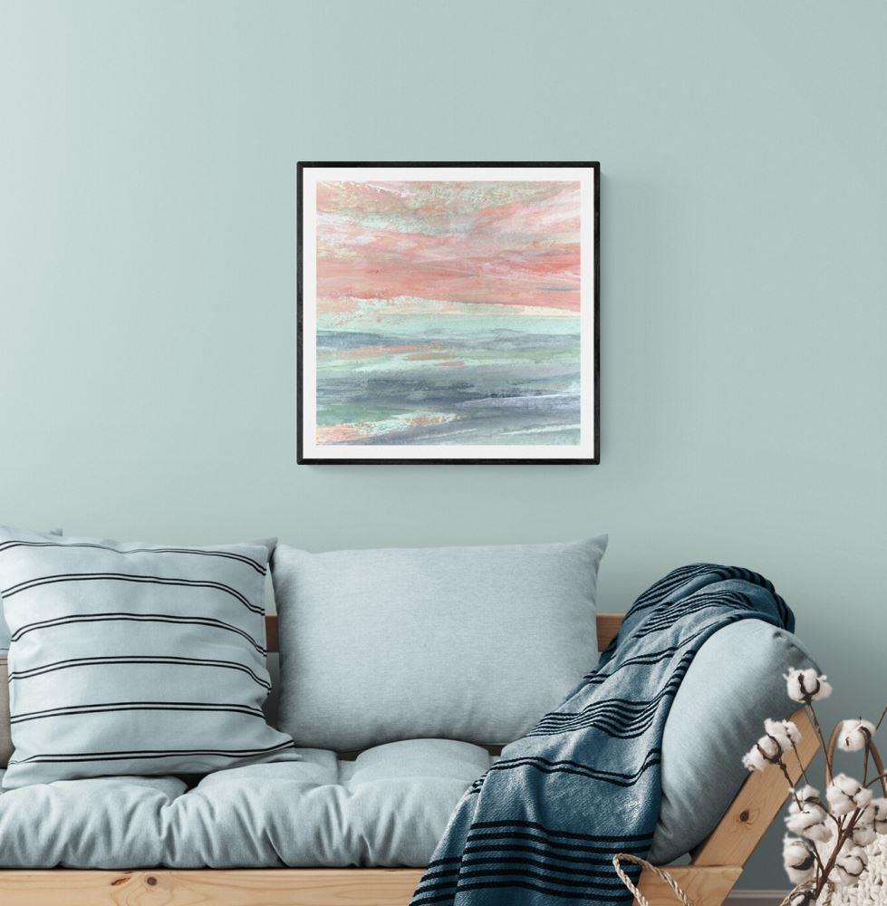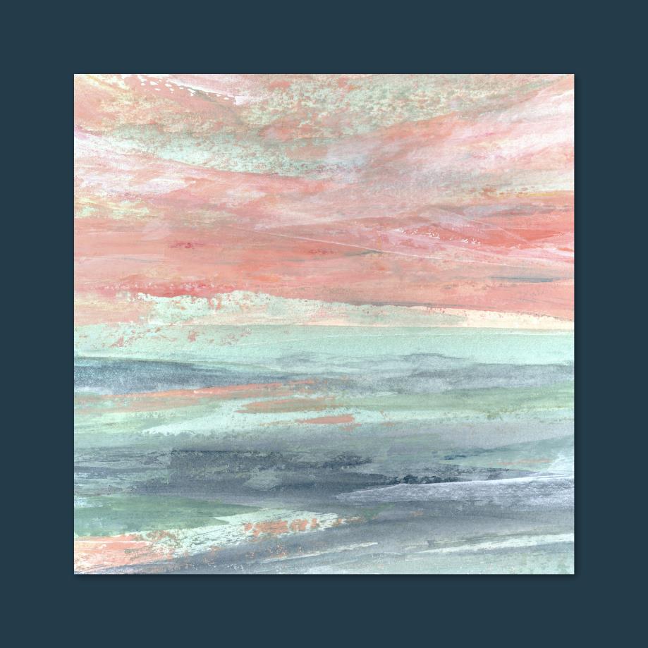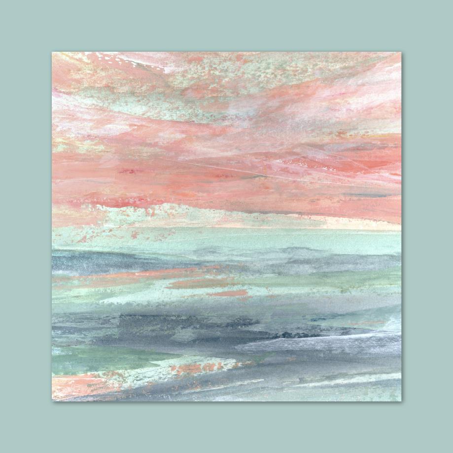 'A Dreamy Sea Balm' print of acrylic & watercolour semi abstract seascape art. The 'Dreamy Seascapes' collection is inspired by those walks by the sea when the sea feels almost dreamlike with beautiful aquamarine waves and a shimmer dancing across the waves.