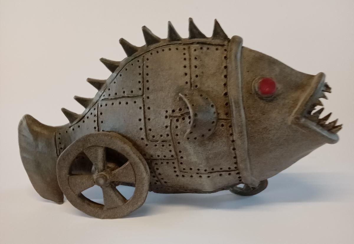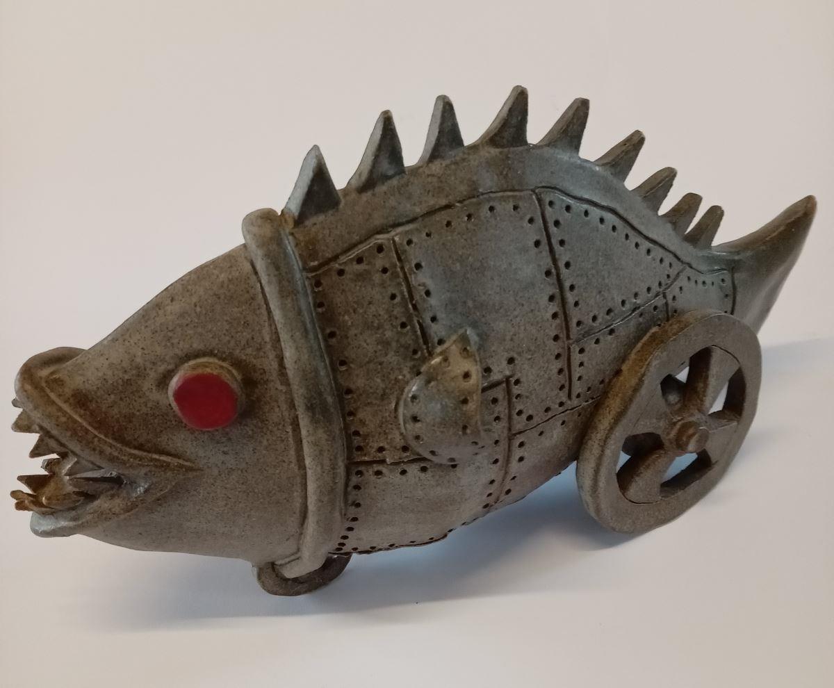 A steampunk fish, armour plated with rivets and red teeth and eyes looking very fierce. Funny and whimsical, ideal in an office or man cave. Fishes need wheels in the steampunk universe