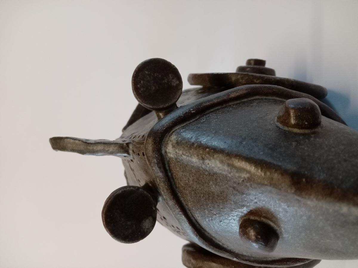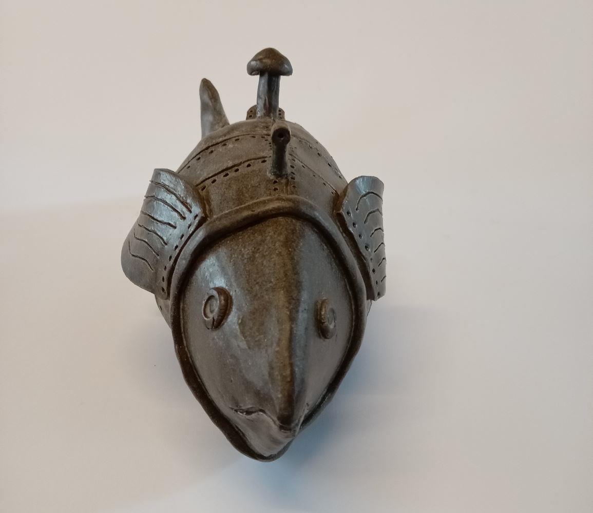 Acrylic on ceramics (A steampunk fish on wheels covered with armour plate)