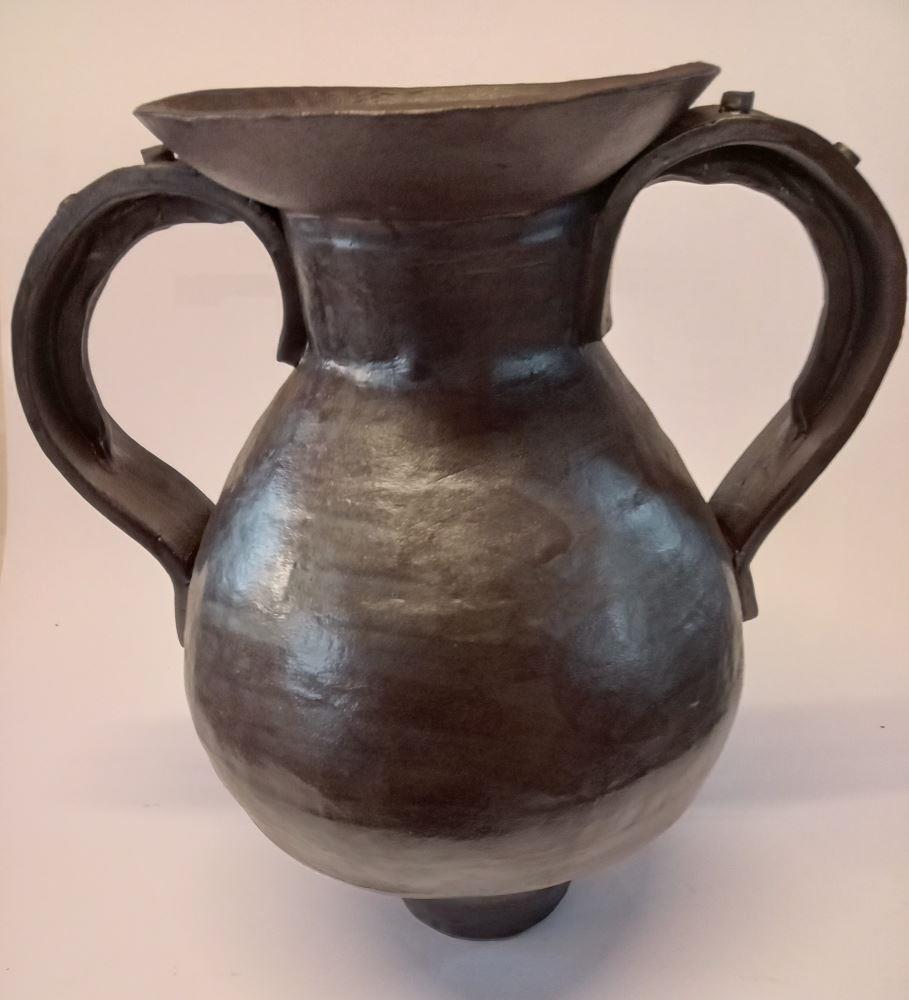 A handbuilt vessel form with shapely handles and foot in black glaze. Unique. home or office.