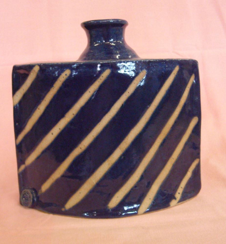 Ceramics on ceramics (a small oval bottle in stoneware paperclay with dark blue glaze and wax release stripes)