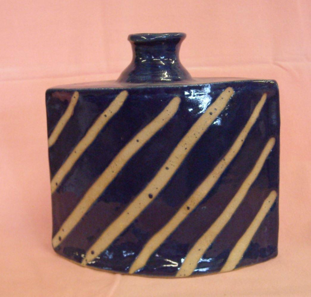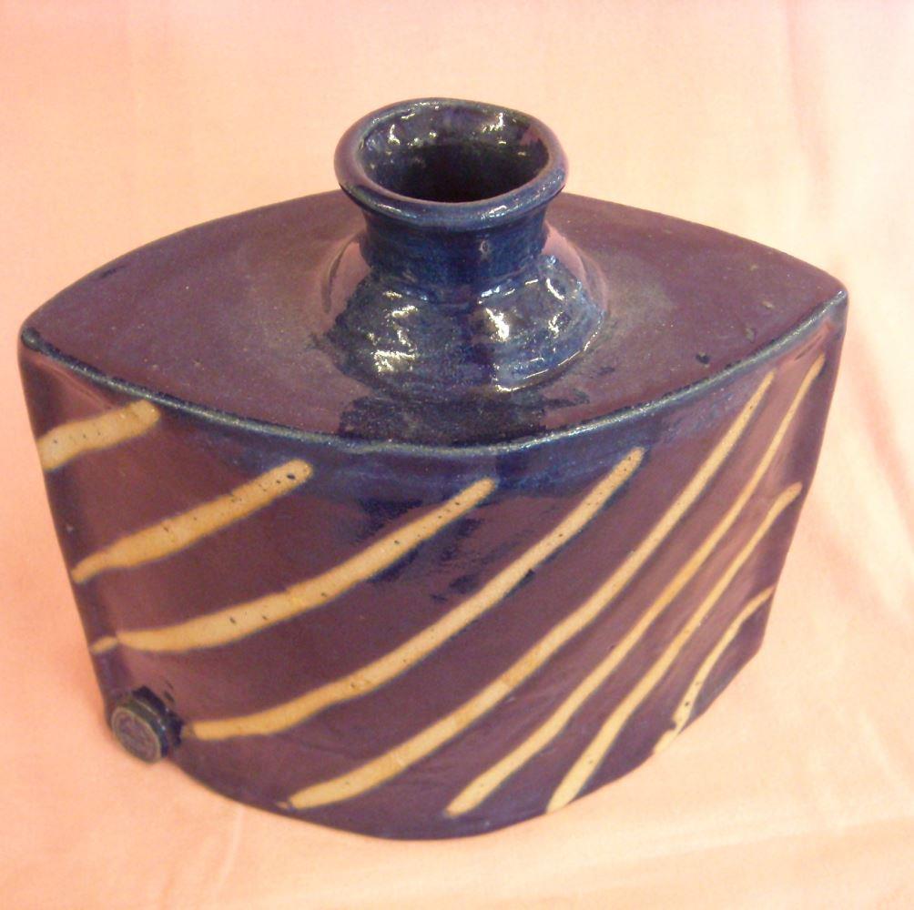 A small oval bottle. Handmade and hand glazed in dark blue glaze with wax release stripes very contrasting. Nice little thing can be useful as a vase for grasses or dried flowers. For home, office or workplace.