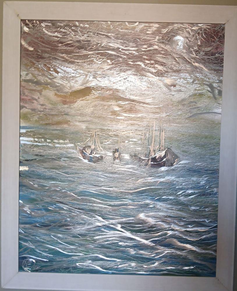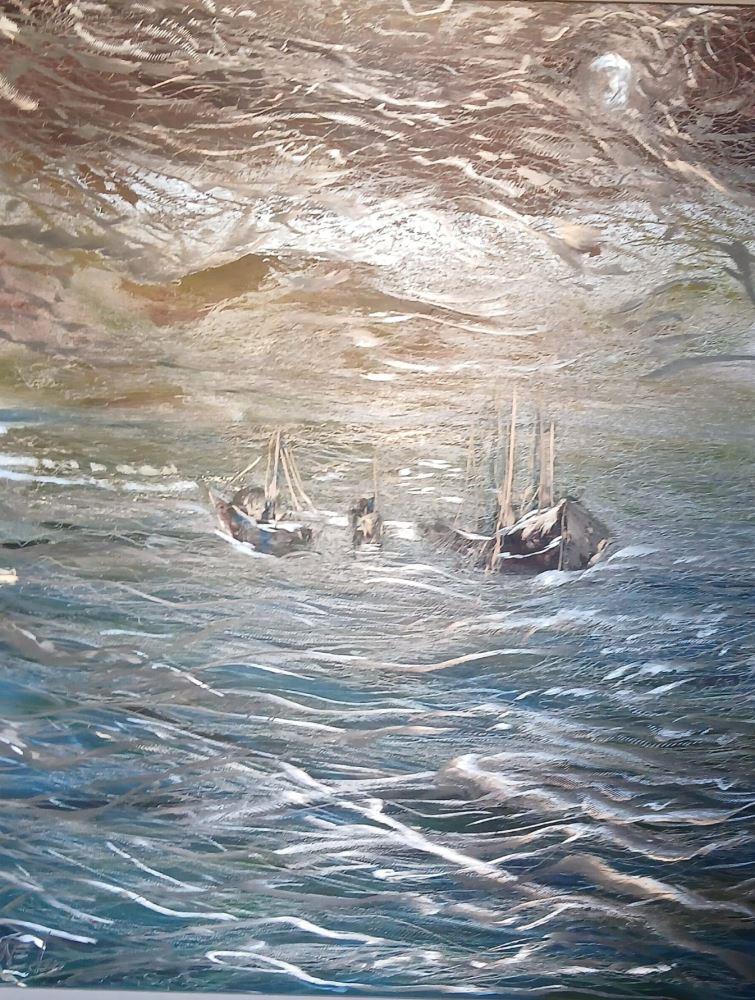 In Trawlers off Iceland I, Nick Coley captures the stark beauty and tension of life at sea. The engraved aluminium surface shimmers with light and movement, evoking the icy waters and shifting skies of the North Atlantic. Two trawlers navigate through a textured expanse of silvered waves, their delicate outlines set against a turbulent, metallic sky. The reflective surface enhances the sense of atmosphere, making the scene come alive as light changes throughout the day.
