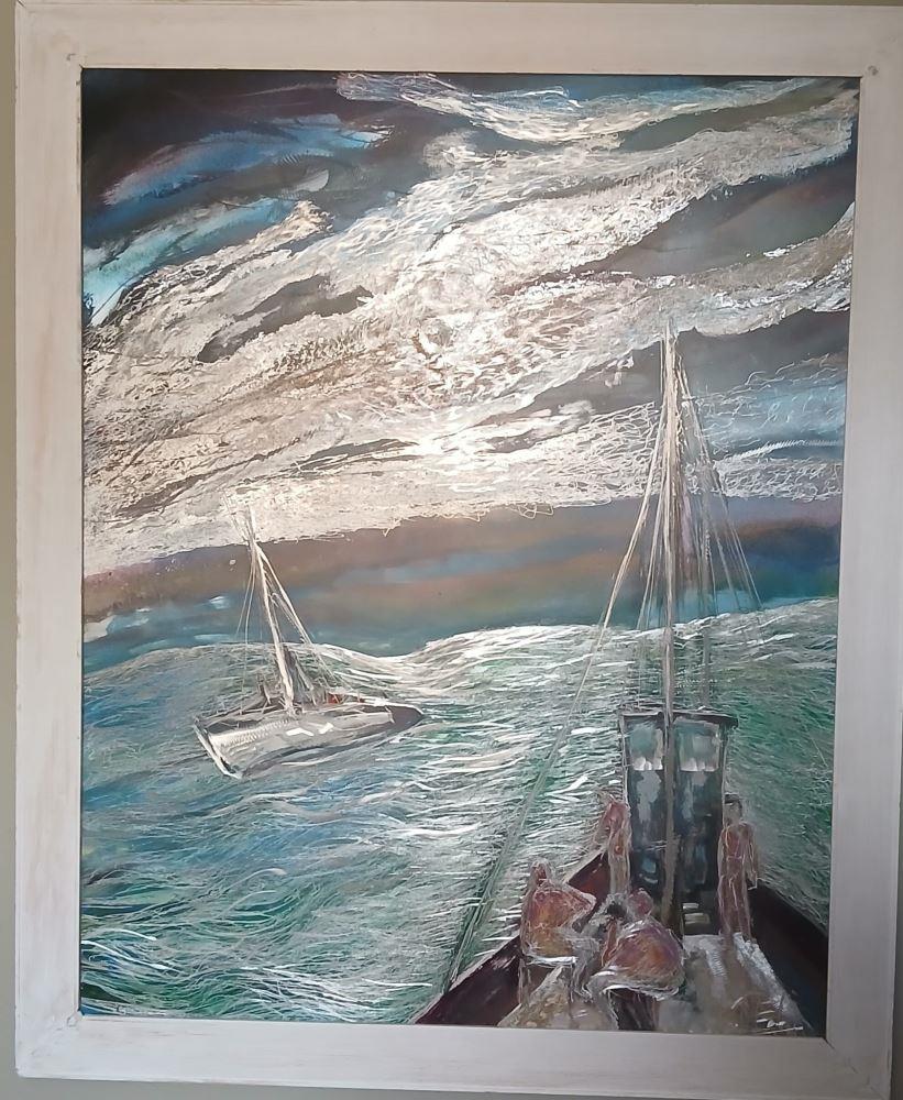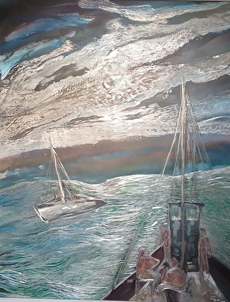 In Trawlers off Iceland II, Coley immerses the viewer in the experience of the crew at work. Seen from the deck of a trawler, figures labour against the backdrop of an immense sea and a luminous, cloud-streaked sky. The engraved aluminium surface, intricately worked and painted, conveys both the physicality of the sea and the human resilience within it. The interplay of light across the metallic texture gives the impression of constant motion — a vivid portrayal of endurance and artistry in one.