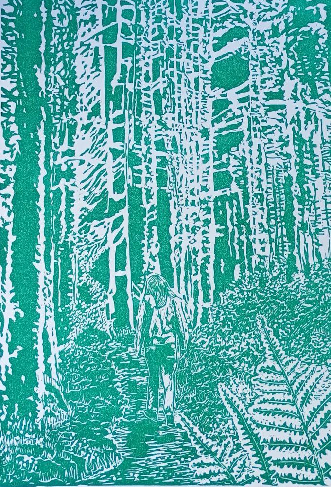 This picture depicts a woodland scene featuring a figure walking along a path admidst tall larch trees. The rtwork in rich green conveys a sense of lushness.