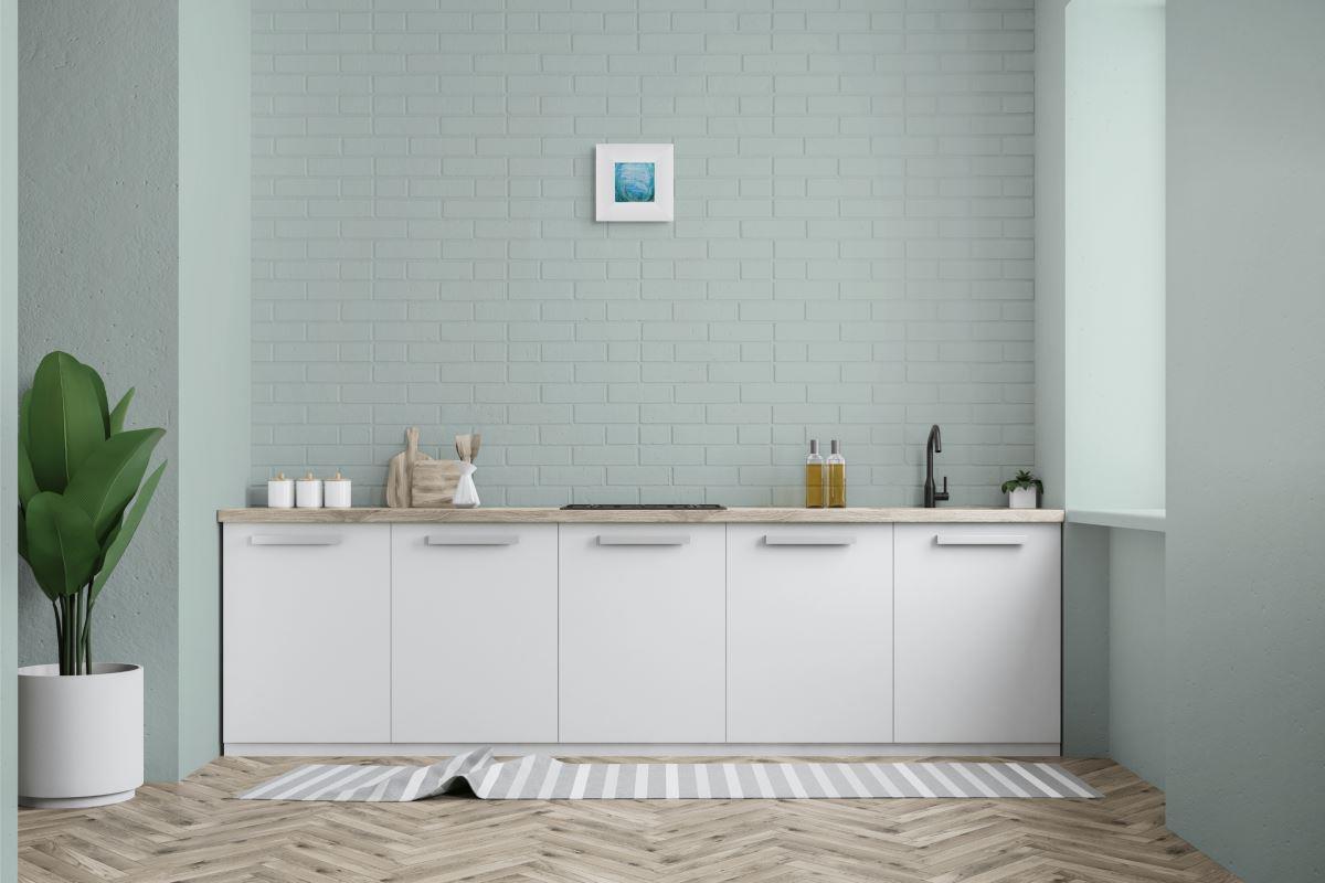 This small square monotype shows an underwater scene. It portrays an aquatic environment with swirling water and tall, curved seaweed framing the composition. Two tuna fish swim towards the right. The background of layered blues and greens with soft textures gives a calm impression.