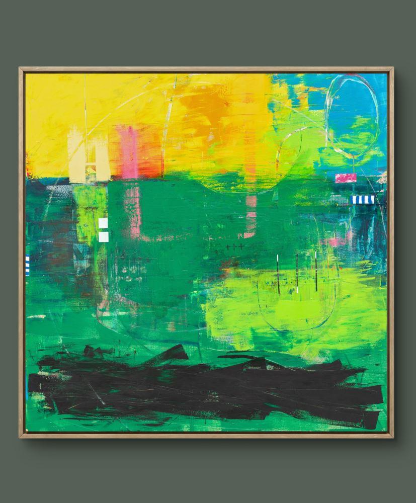 Tethered is an abstract mixed-media painting that balances vibrant energy with quiet structure. Layers of luminous yellow and rich green are built through gestural marks, translucent washes, and linear elements that suggest both movement and intention.