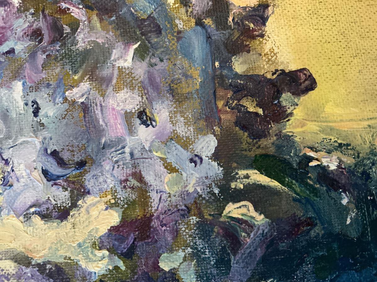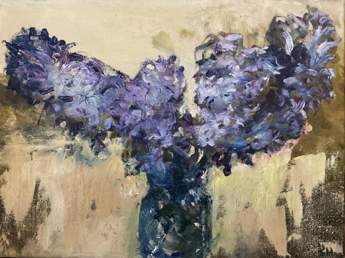 Blue hyacinths in January. Expressive loose brush and palette knife work in shades of blue, mauve and cream. Ready to hang.