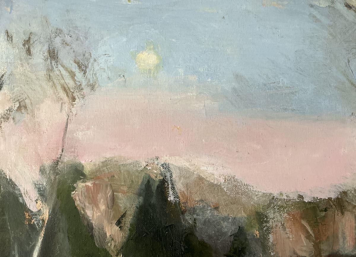 At daybreak, the moon is still reflecting soft light over neighbouring gardens. Pink sky of sunrise contrasting with the dark shadows on the ground and silhouettes of trees.
