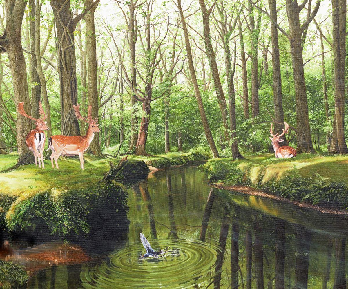 3 Fallow Deer looking at each other across a river within a forest in the warmth of summer