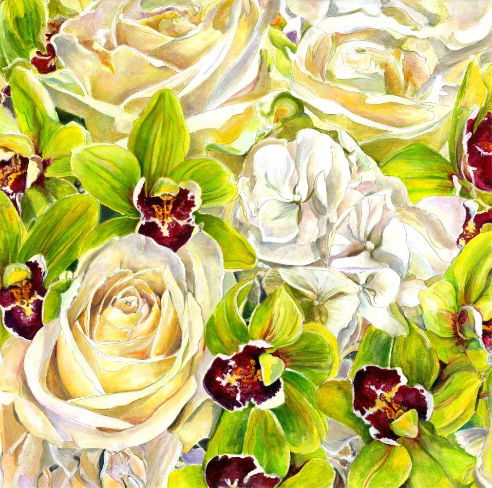A mass of Orchids and Roses shown in my signature style close up with intense colours.
