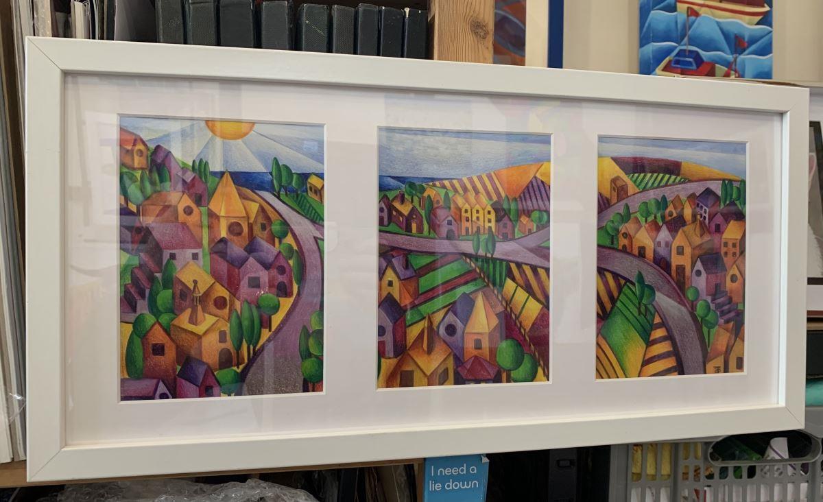 This is a coloured pencil triptych drawing of my favourite fictional village I have created. Each section is 12cm x 17cm, then mounted and framed in white creating a striking picture.