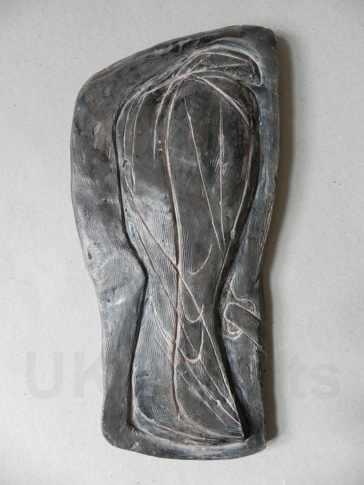Sculpted relief in plaster of Paris depicting a hawk from behind. Inscribed lines within the image of the bird evoke the focused energy of a raptor.